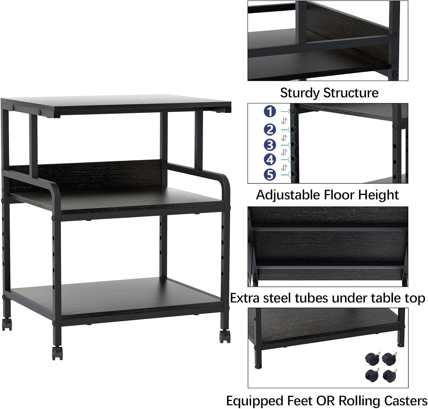 - 【Adjustable Design & Two Options】:This is a flexible and versatile rolling printer stand. The adjustable layer design greatly improves the space utilization and can be used to place machines or documents of various sizes. And with adjustable feet and rolling casters, you can choose between full stability or mobility.