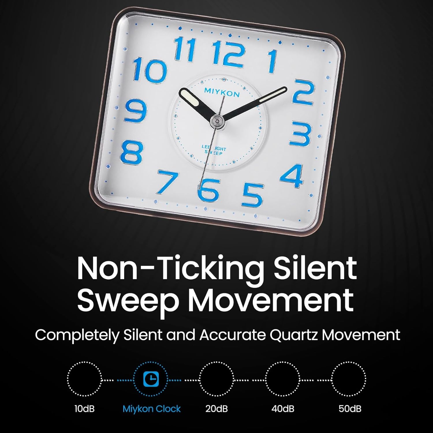 Miykon Small Square Analog Alarm Clock – Silent Non-Ticking, Battery Operated with LED Light & Snooze – Desk, Table, Travel or Bedside Clock for Bedroom, Office, Bathroom – Black 4 Inch