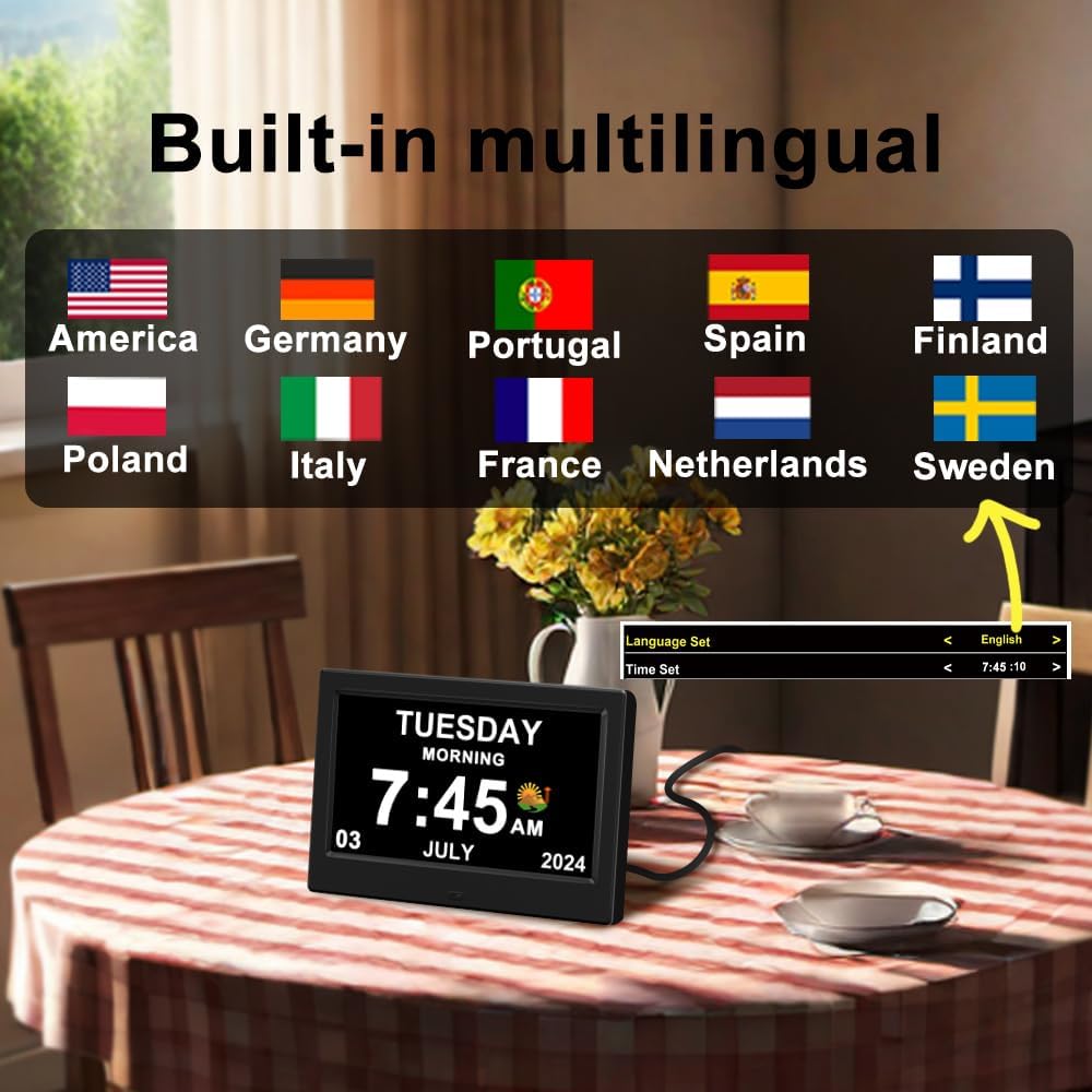 Alarm Clock with Day and Date for Elderly Digital Calendar Clock Photo Frame- Auto Dimmable Display 15 Alarm Options (7inch Black)