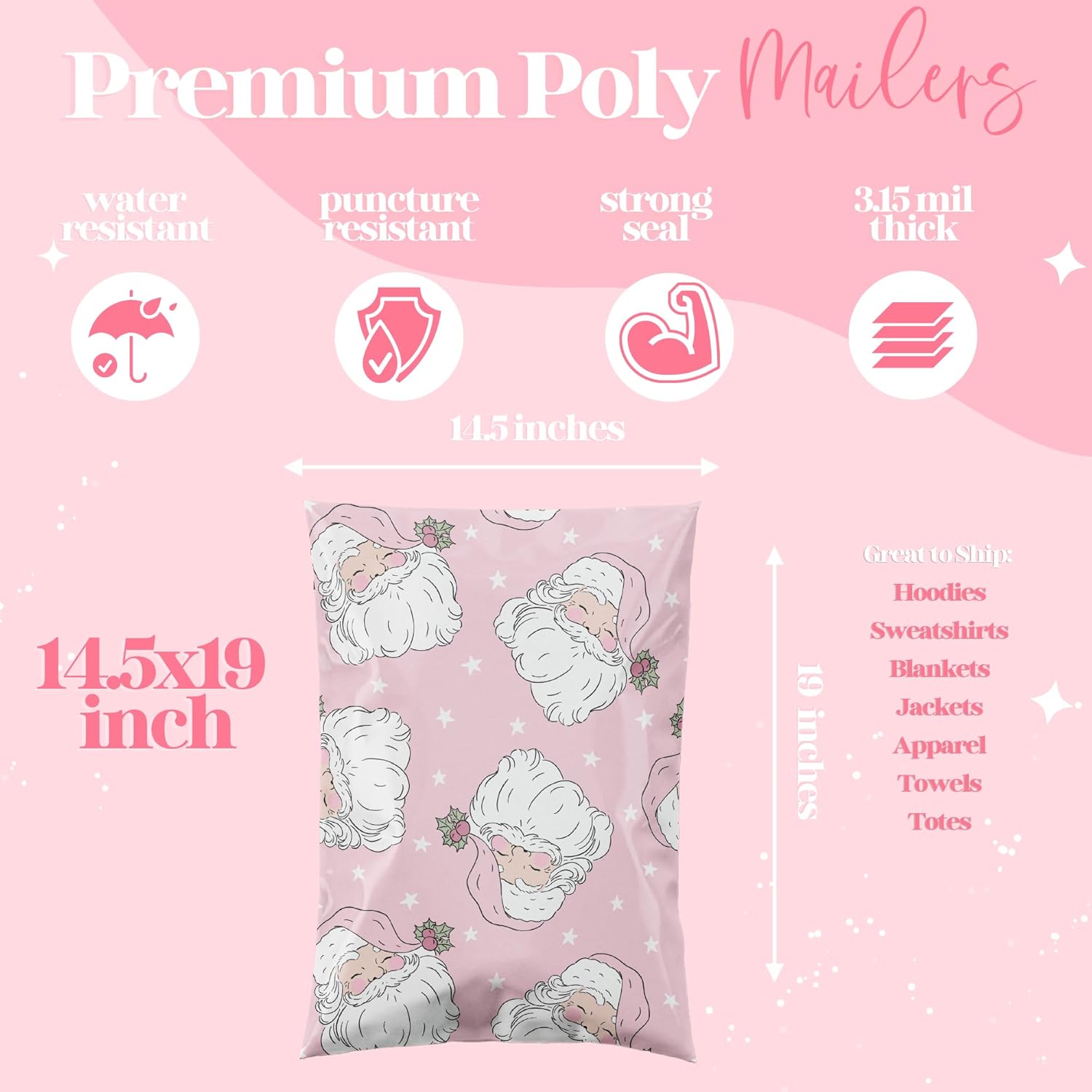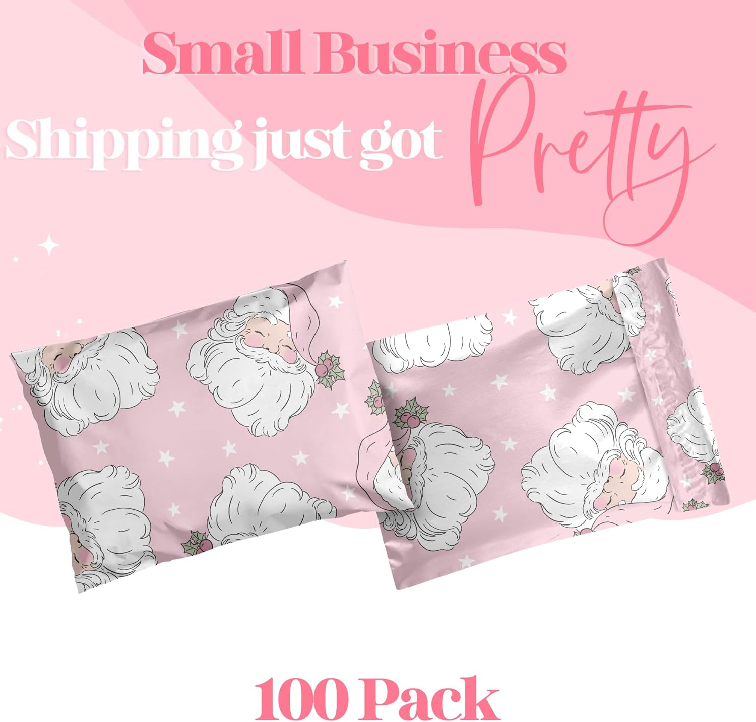 6x9 Designer Christmas Holiday Poly Mailers 100 Pack Heavy Duty Waterproof Self Seal Shipping Bags Large Mailing Envelopes Bulk Tear Resistant Cute Packaging Pink Santa