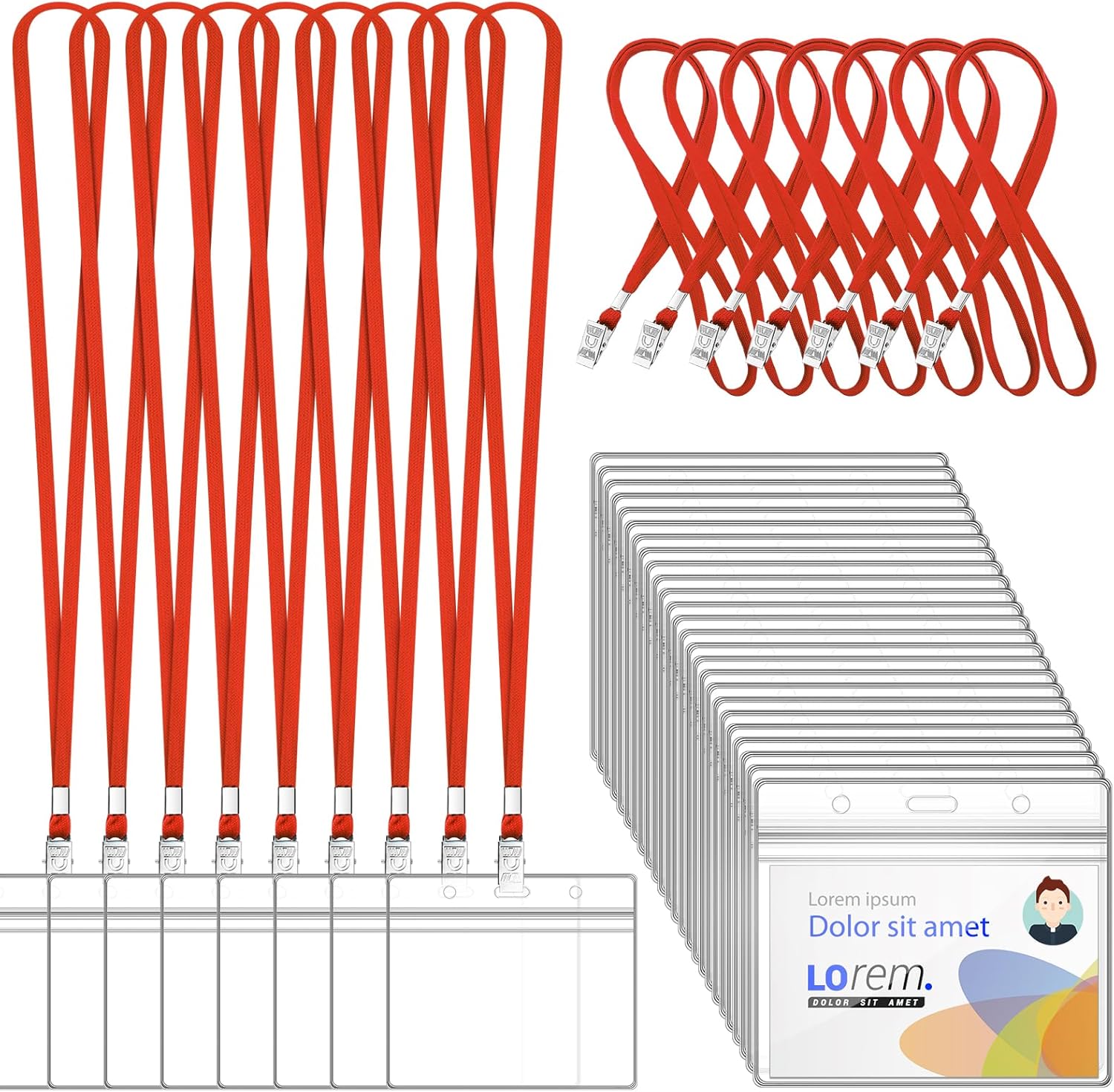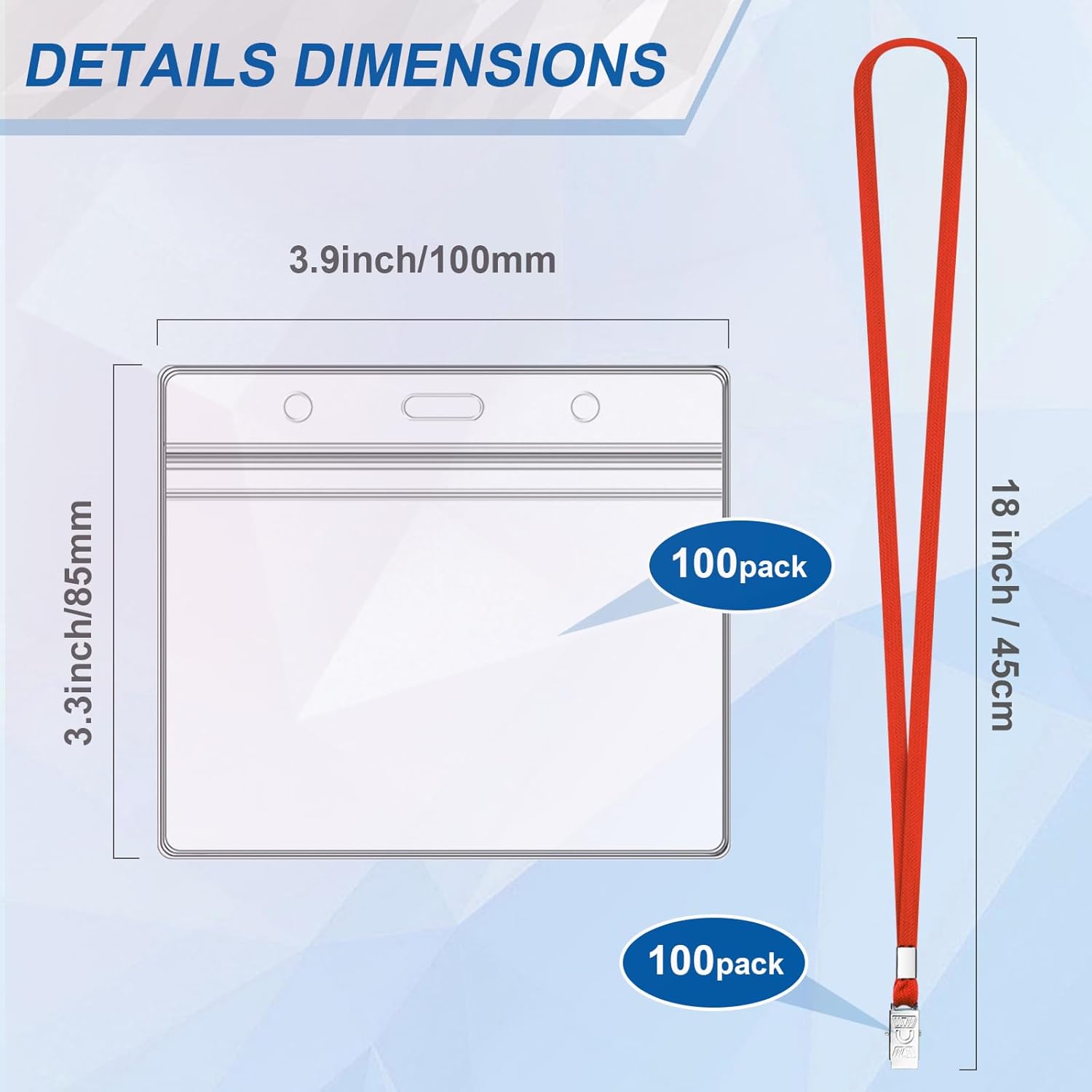 100Pcs Lanyards for ID Badges and 100 Pcs Clear Plastic Horizontal Name Badge ID Card Holders, Flat Neck Lanyards with Clip Waterproof Resealable Name Tag Badge ID Card Holders (Red)