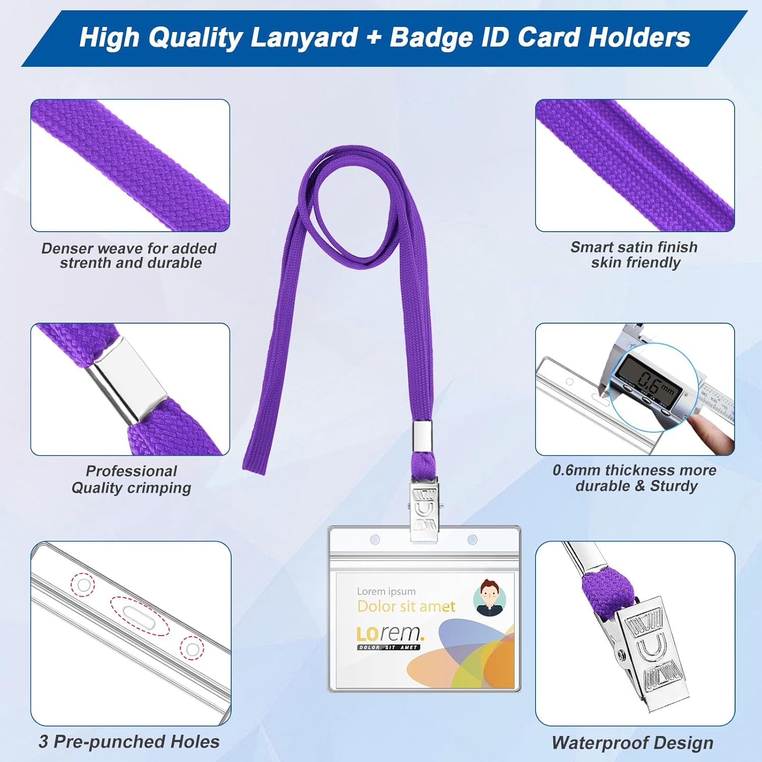 100Pcs Lanyards for ID Badges and 100 Pcs Clear Plastic Horizontal Name Badge ID Card Holders, Flat Neck Lanyards with Clip Waterproof Resealable Name Tag Badge ID Card Holders (Purple)