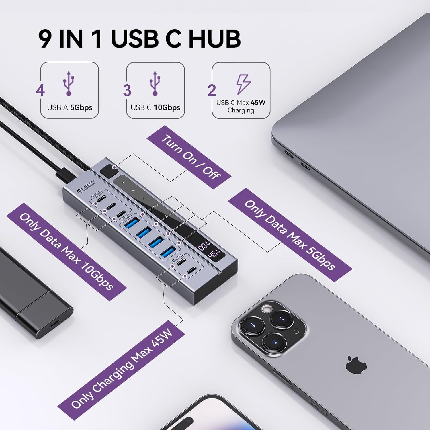 - 【Minisopuru 9-IN-1 USB C Hub】: The Powered USB Hub is equipped with 2* USBC (Single-Max 45W, Dual-Max 24W) charging ports, 4*USBA 3.0 data ports 5Gbps and 3*USBC 3.2 data ports 10Gbps. ★Note: All ports of the Powered USB C Hub do not support video output.
