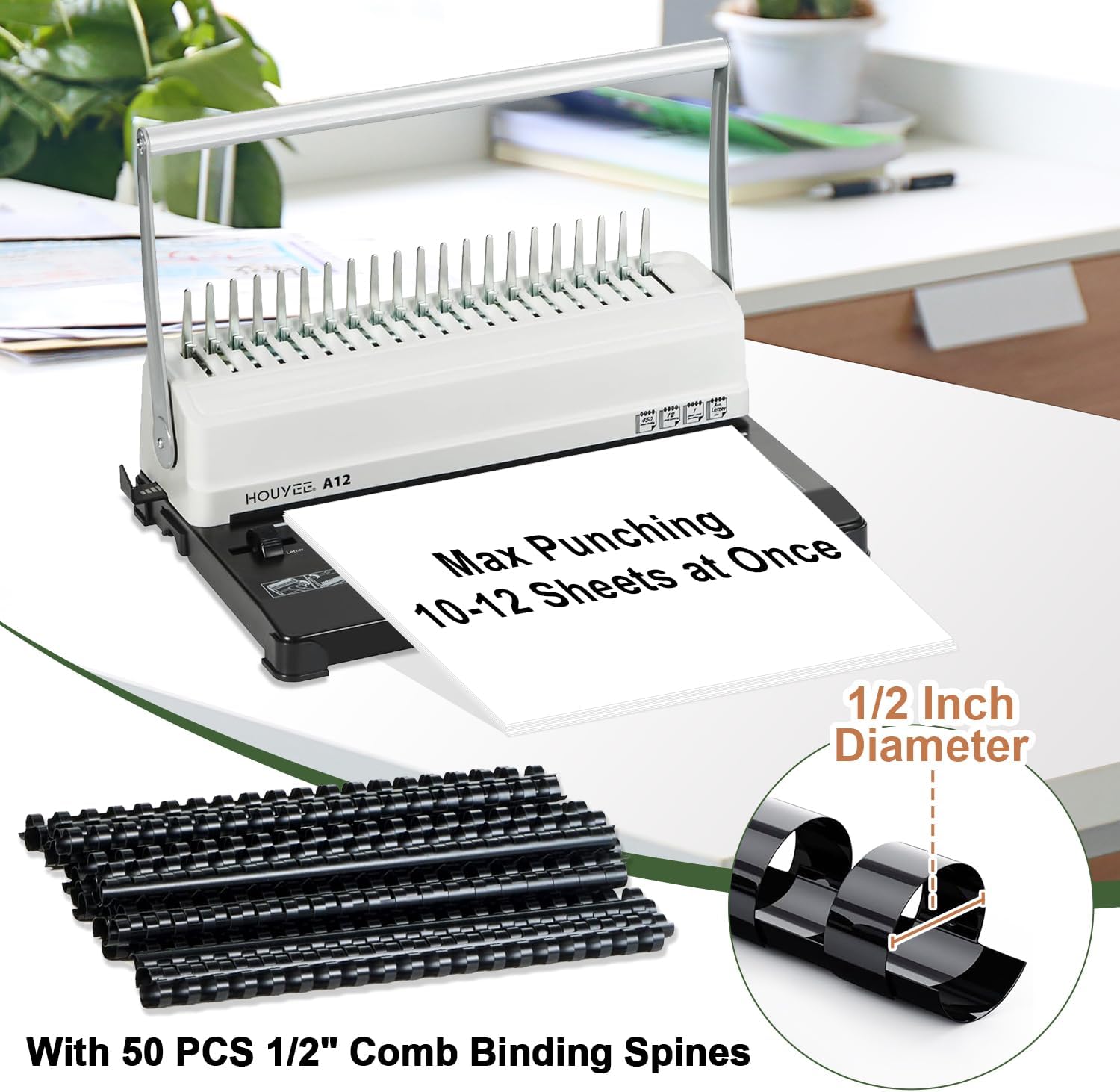 - 【HOUYEE Comb Binding Machine Kit, Great Value for Money】: Includes 1 comb binding machine and 50pack 1/2 inch black comb binding spines (for 61-90 sheet binding capacity).