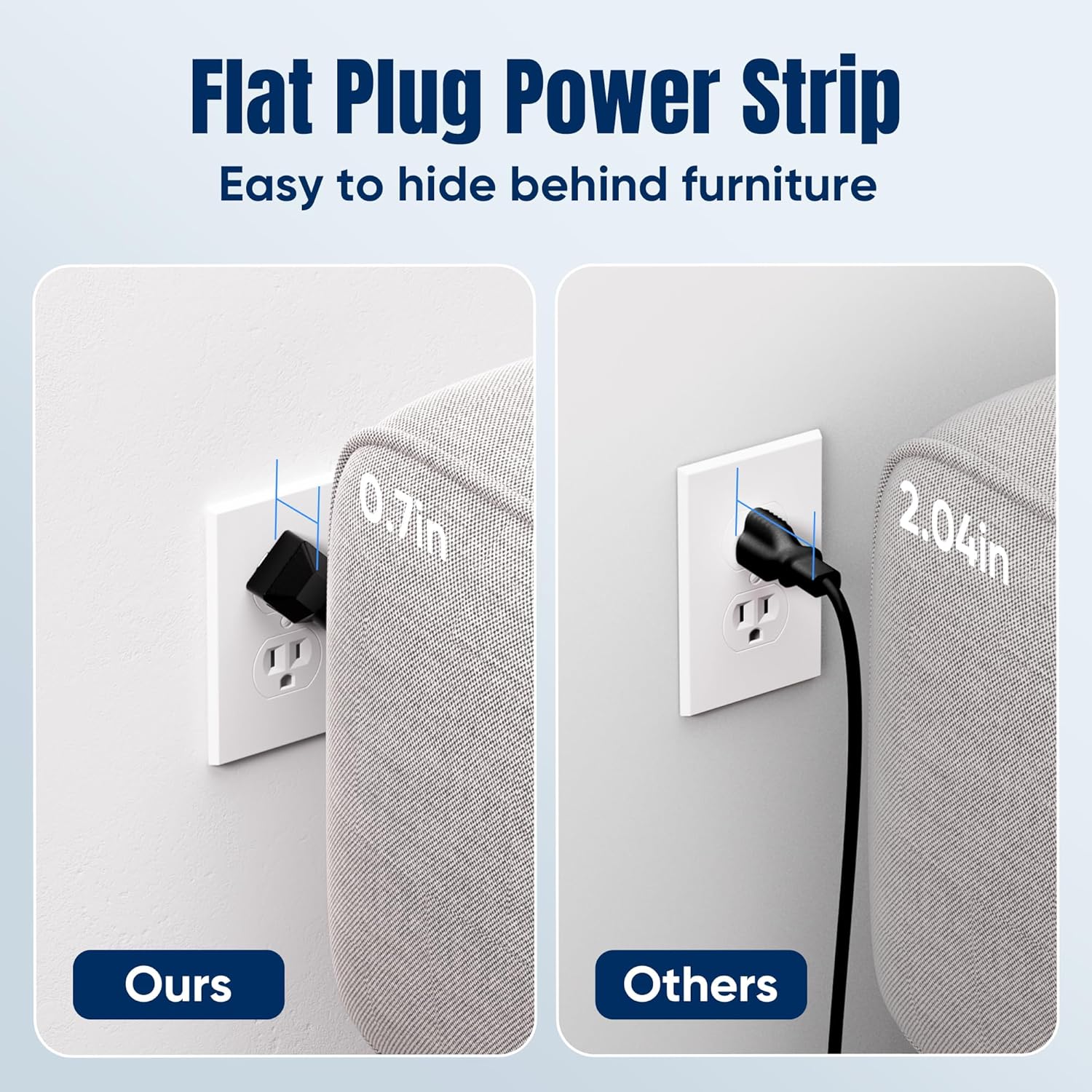 - đ ăSpace Saving Designă- Experience the ultimate in space efficiency with JouleLoom 10FT surge protector's slim flat plug, measuring a mere 0.7 inches thick. Unlike traditional plugs, its unique 45-degree right-angle design ensures it won't obstruct neighboring outlets. Plus, with two multi-directional hanging holes, you can easily mount it horizontally or vertically on workstations, walls, counters, bedrooms, optimizing your space like never before.