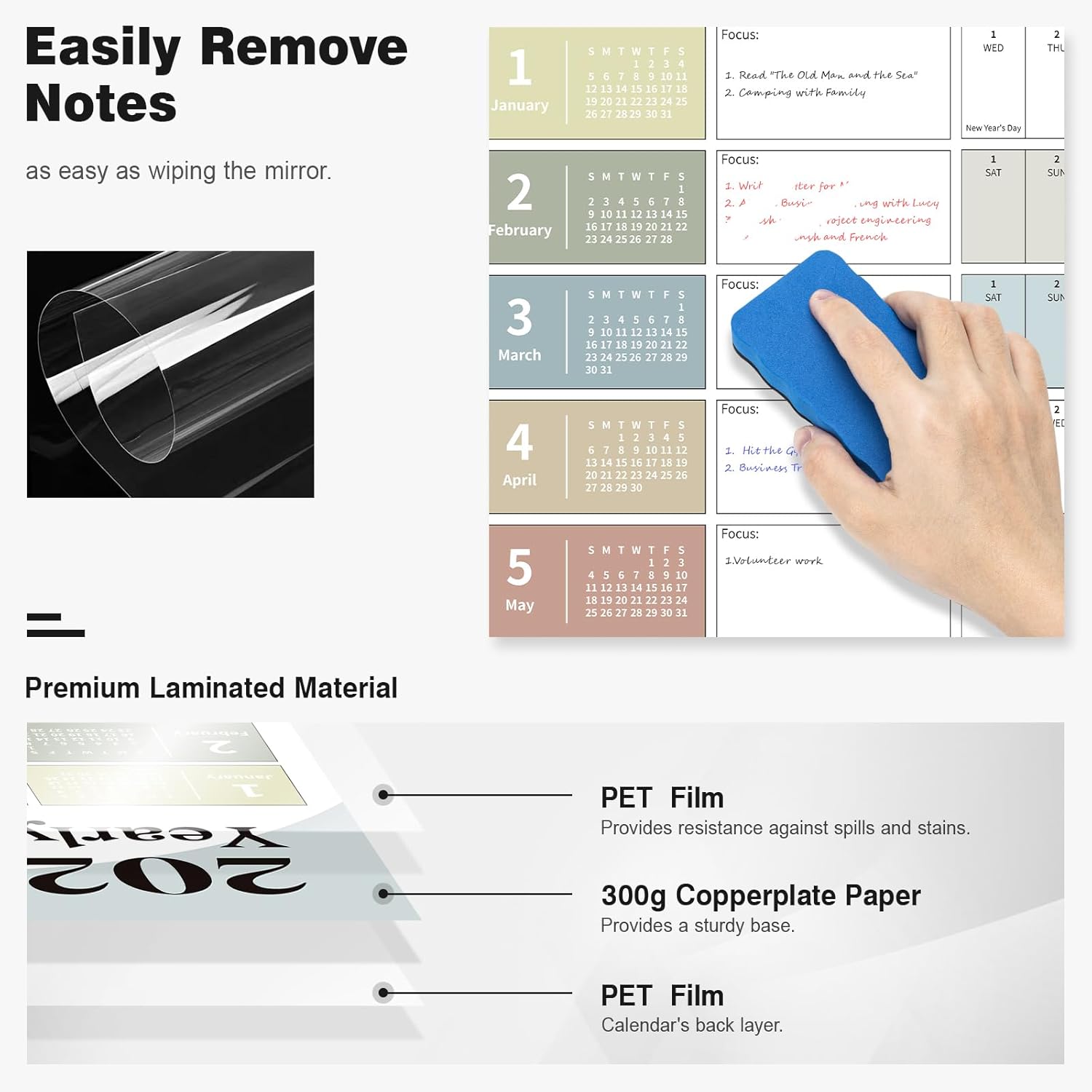 - ⨠Dry Erase Wall Calendar : is made of PET Film and 300 grams Copperplate Paper, providing a durable surface that resists scratches and smudges, while the sturdy Copperplate Paper backing keeps it in place without curling.