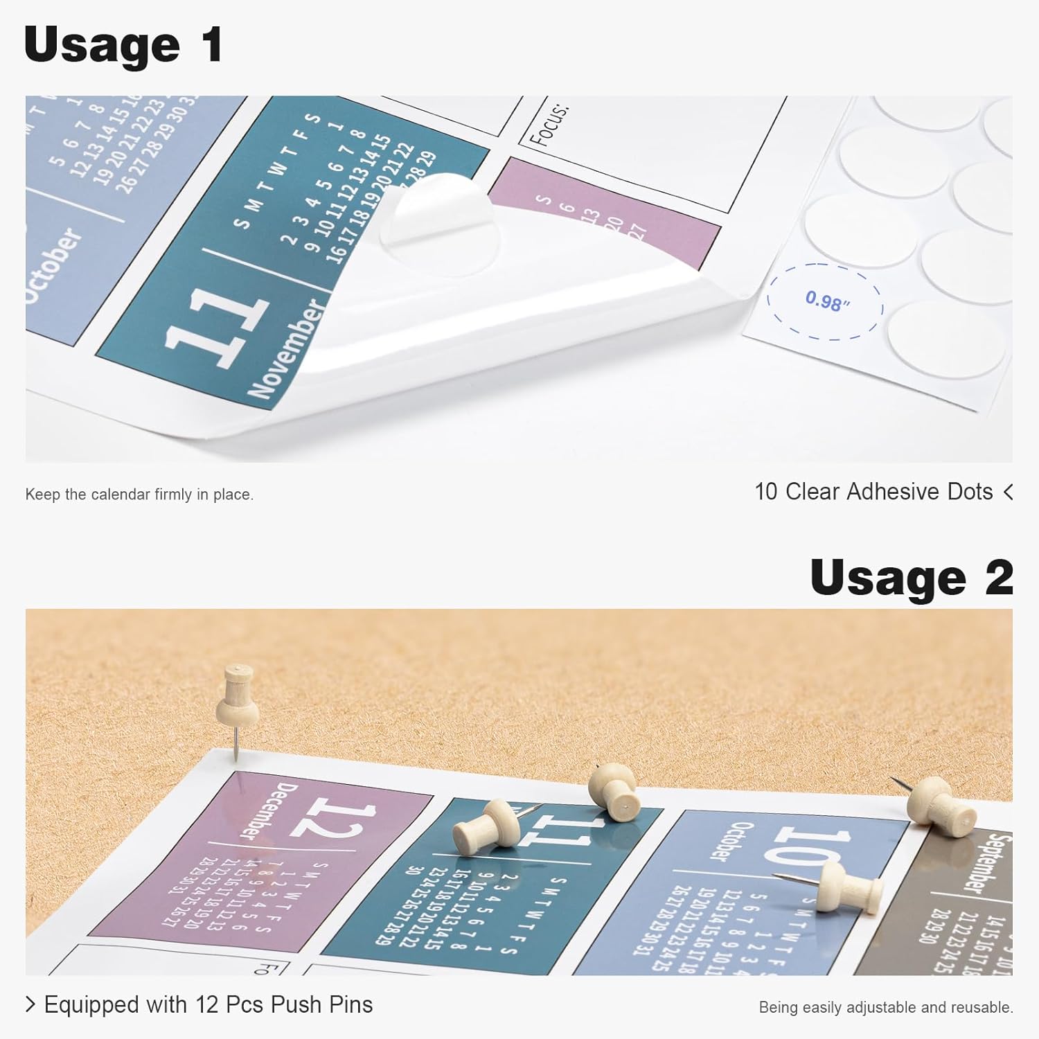 - ⨠Laminated Calendar with Dates: Waterproof wall calendar comes with a mini eraser, four dry-erase markers, 12 push pins, and 10 transparent round stickers. 12 months calendar covers the time range from Jan 2025 to Dec 2025, making it perfect for long-term use.