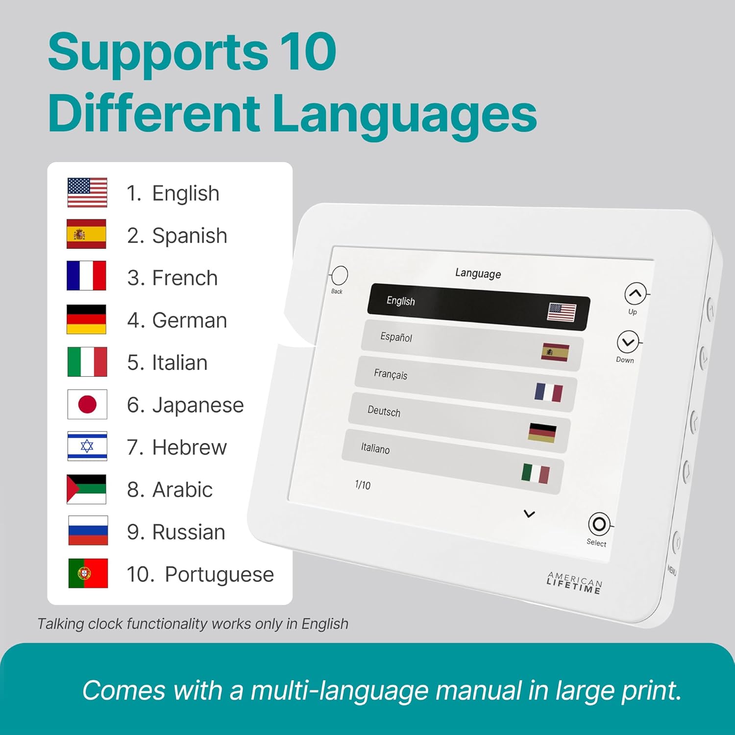 - Reliability and Peace of Mind: The American Lifetime talking clock has an internal backup solution that allows it to automatically reset itself to the right time and date in the event of a power failure. It will retain all the information, including the alarms and themes.