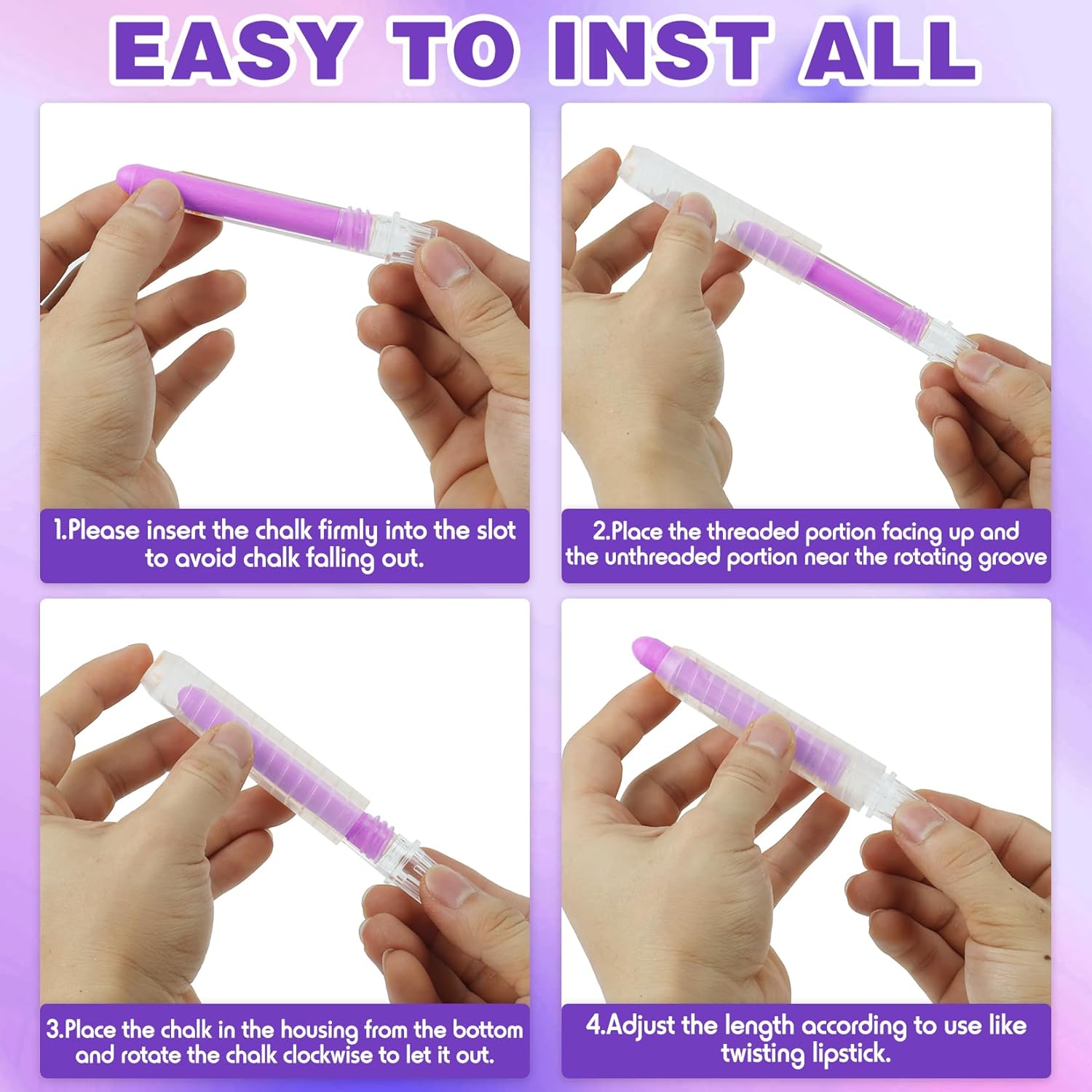 - 【Easy to Use】- Our dustless chalk comes with an adjustable chalk holder that rotates like a lipstick, kids won't break chalk or make a mess anymore. The dust free colored chalk set has an overall length of 3.9 inches and is easy to hold and comfortable in your hand perfect for kids to use and adults to use as well. Note: Dustless chalk should be wiped with a magnetic board eraser. To clean the chalkboard, wet a damp cloth and wipe the surface of the board, then dry it with a dry cloth.