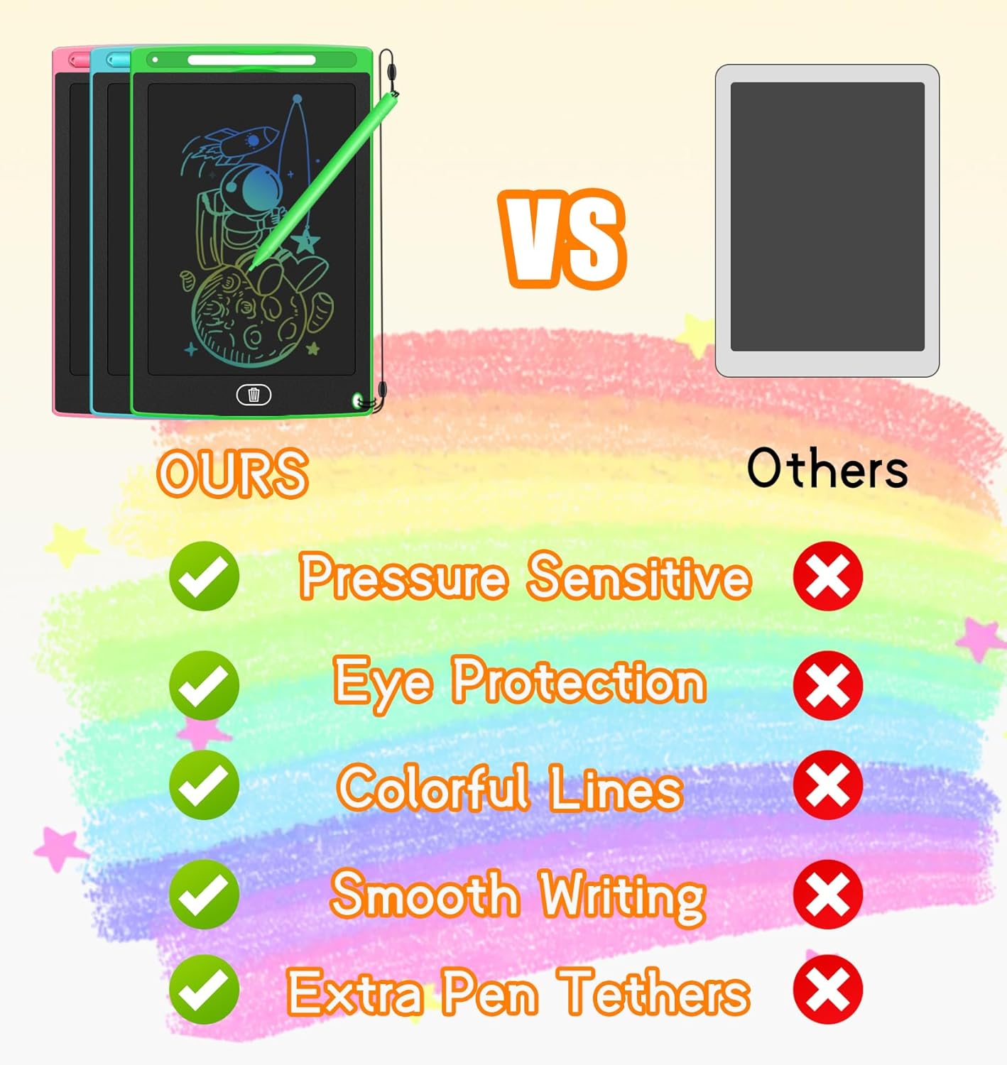 - Innovative Creativity: LCD tablet uses the latest LCD pressure sensing technology, which is brighter and clearer than former LCD writing tablets. Kids write lines of different thicknesses and colors by pushing strength on the pens.