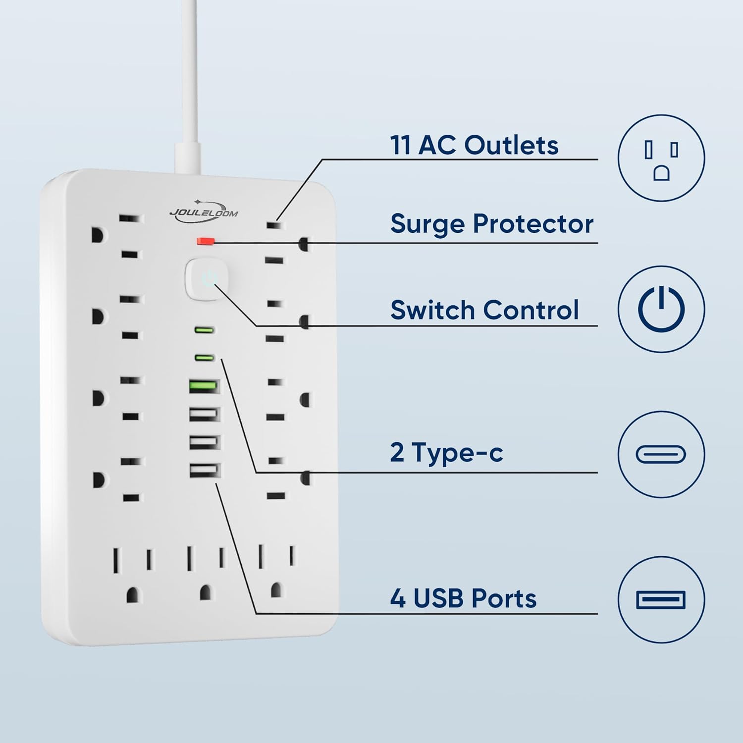 - đăIntelligent USB Chargingă- Streamline your charging setup with this surge protector featuring smart USB port technology. Equipped with 4 USB-A and 2 USB-C ports (Max 12W/2.4A), it ensures optimized charging for smartphones, game consoles, eliminating the need for bulky USB chargers.