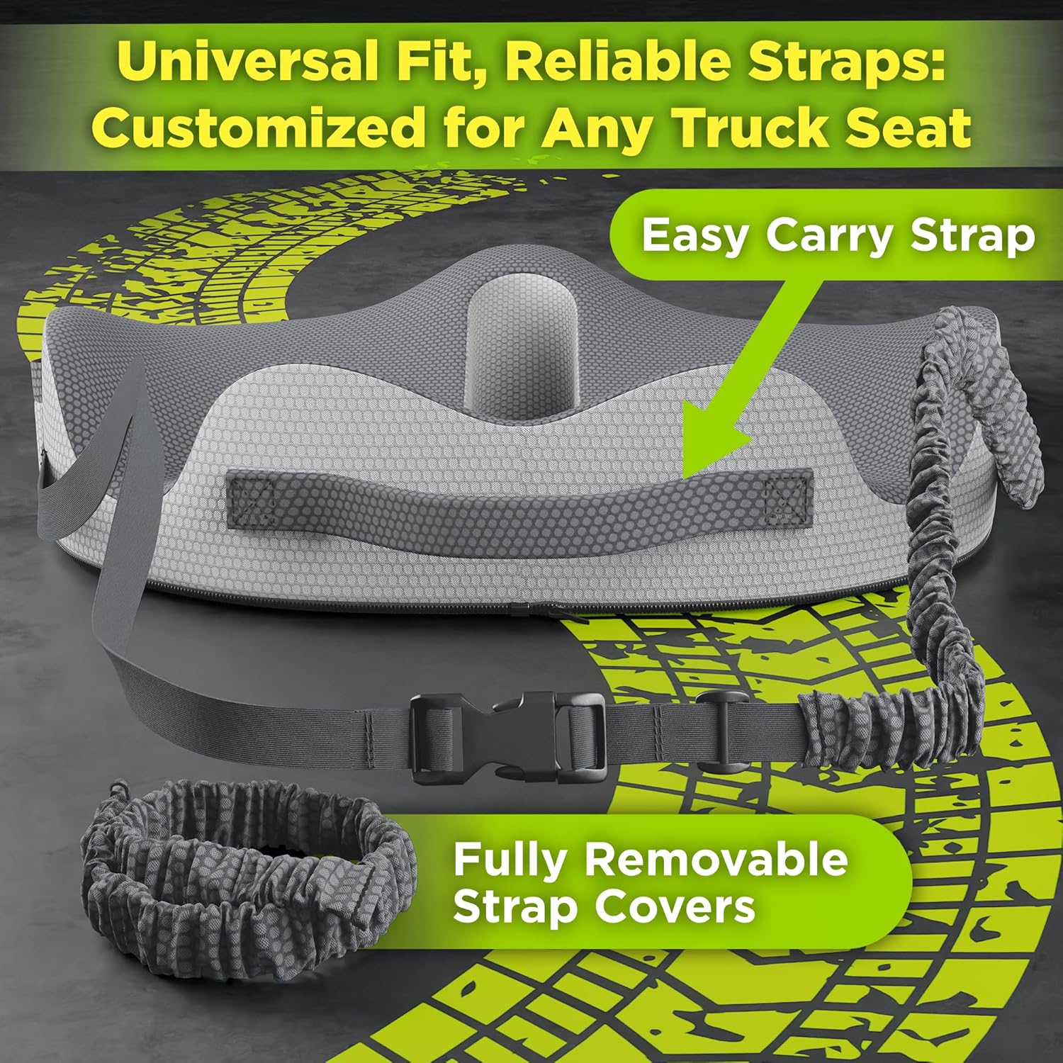 - 🧵【𝐓𝐨𝐮𝐠𝐡 𝐄𝐧𝐨𝐮𝐠𝐡 𝐟𝐨𝐫 𝐋𝐨𝐧𝐠 𝐒𝐭𝐫𝐞𝐭𝐜𝐡𝐞𝐬】- Truck driver seat cushion includes 2 removable & washable covers, non-skid base, and adjustable straps for a secure fit. Crafted to withstand wear & tear of long hauls.
