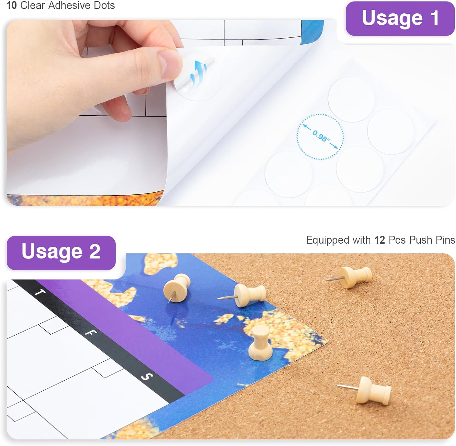 - ⨠Undated Laminated Calendar: This waterproof wall calendar comes with a mini eraser, four dry-erase markers, 10 push pins, and 10 transparent round stickers. The undated monthly calendar can be started at any time, making it perfect for long-term use.