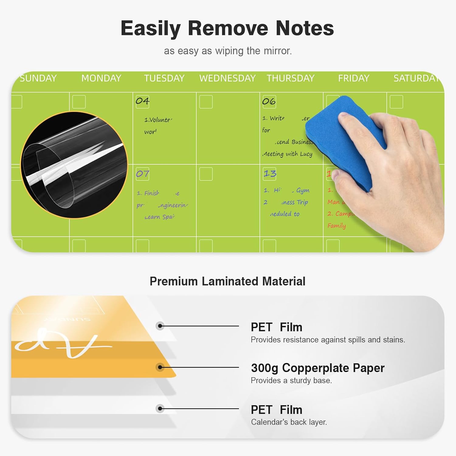 - ⨠Dry Erase Wall Calendar : is made of PET Film and 300 grams Copperplate Paper, providing a durable surface that resists scratches and smudges, while the sturdy Copperplate Paper backing keeps it in place without curling.