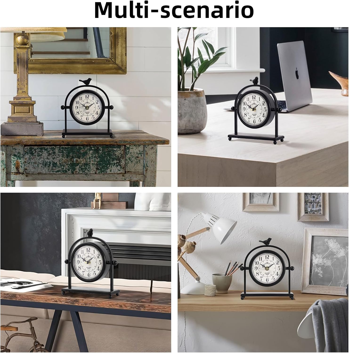 MODE HOME Silent Battery Operated Black Metal Analog Desk Clock with Bird, Small Table Clock for Farmhouse Decor, Mantel Shelf, Home and Living Room