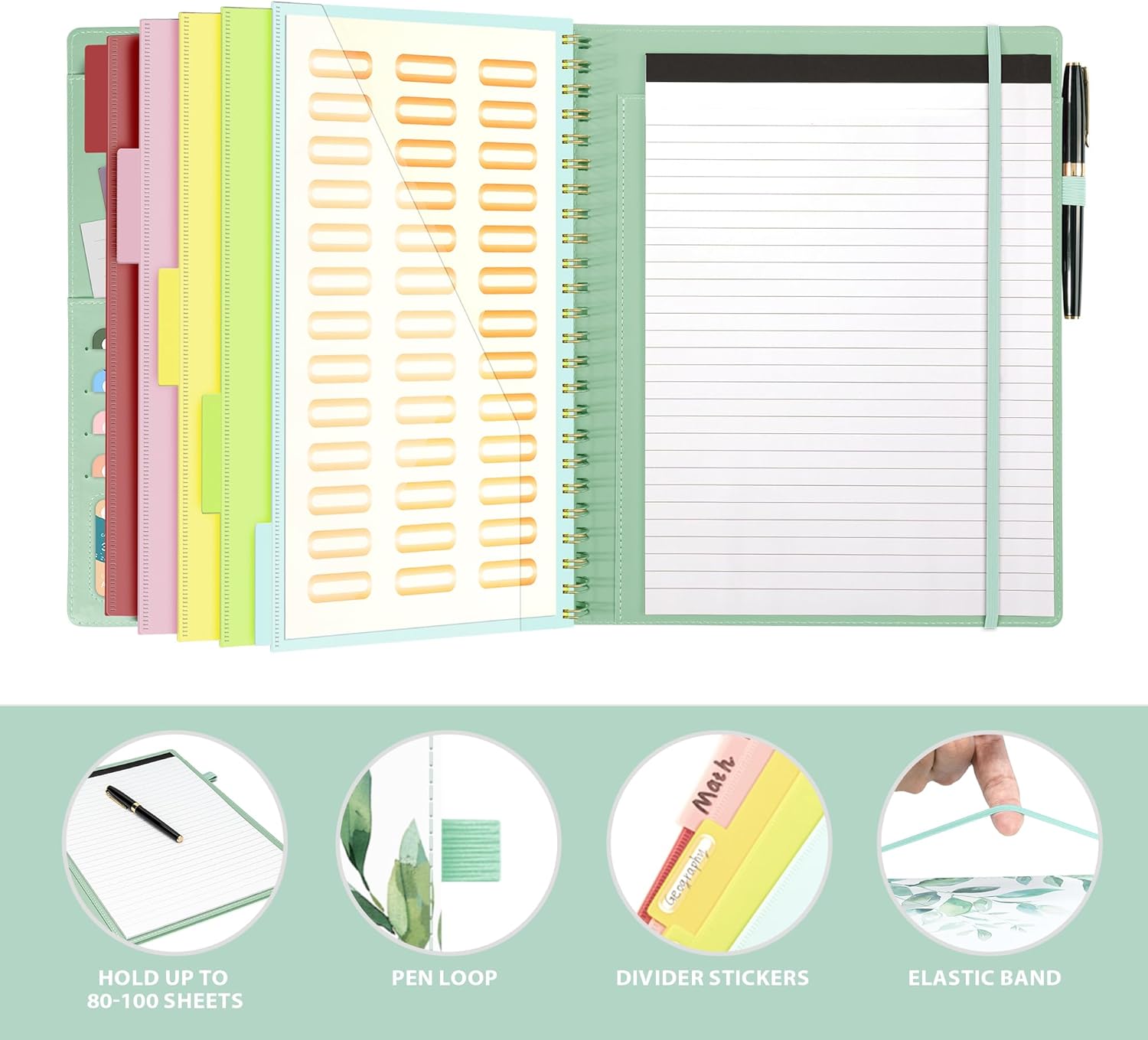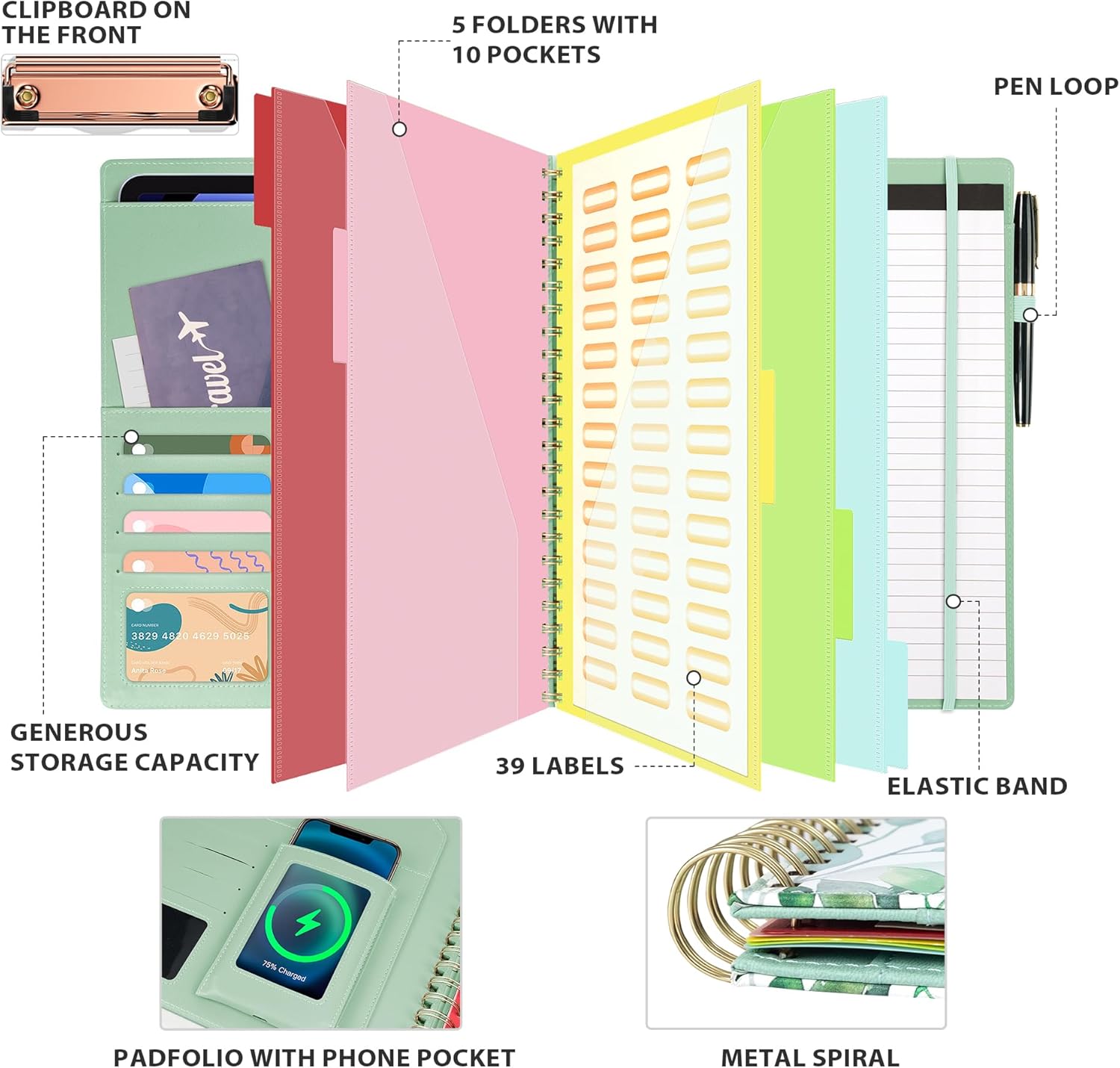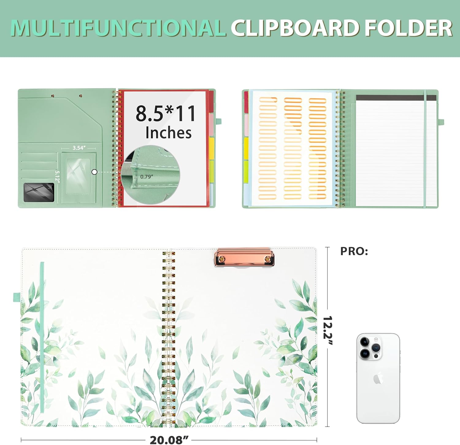 Clipboard with Storage for Men Women, Leather Padfolio Portfolio Organizer 5 Folders with 10 Pockets, Spiral Clipboard Folio with Notepad for Letter Size, Elastic Closure and Pen Loop Green Plants
