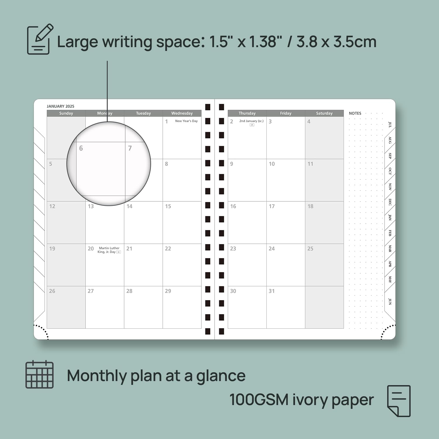 - EXTRA FUNCTION PAGES - Includes a 2025-2026 Yearly Overview, Holiday & Calendar, Monthly Expenses, Contact & Password pages, and 7 dotted notes pages for detailed jotting.