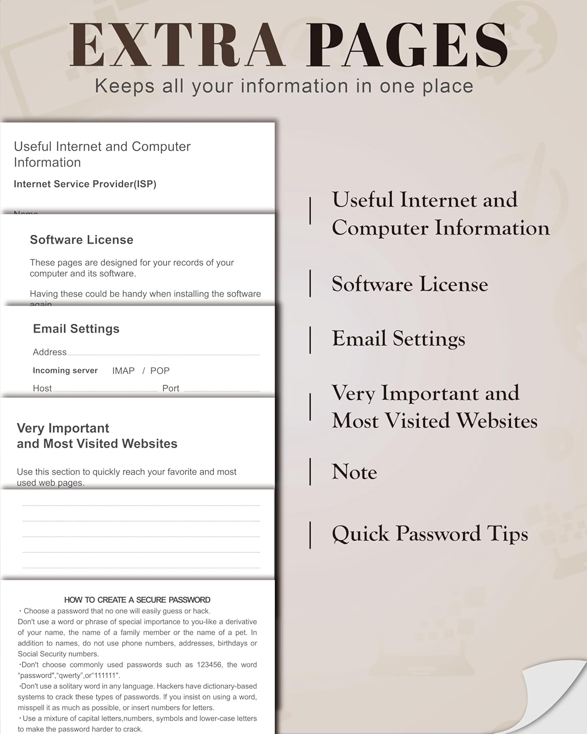 - Easily Store Up to 1097 Passwords: This password notebook, which has 230 pages with 100gsm thick paper, boasts the capacity to store up to 1097 passwords, almost twice as much as similar products on the market. Our password journal also provides ample room for internet service providers, wireless router settings, software licenses, email settings, frequently visited websites, and additional notes.