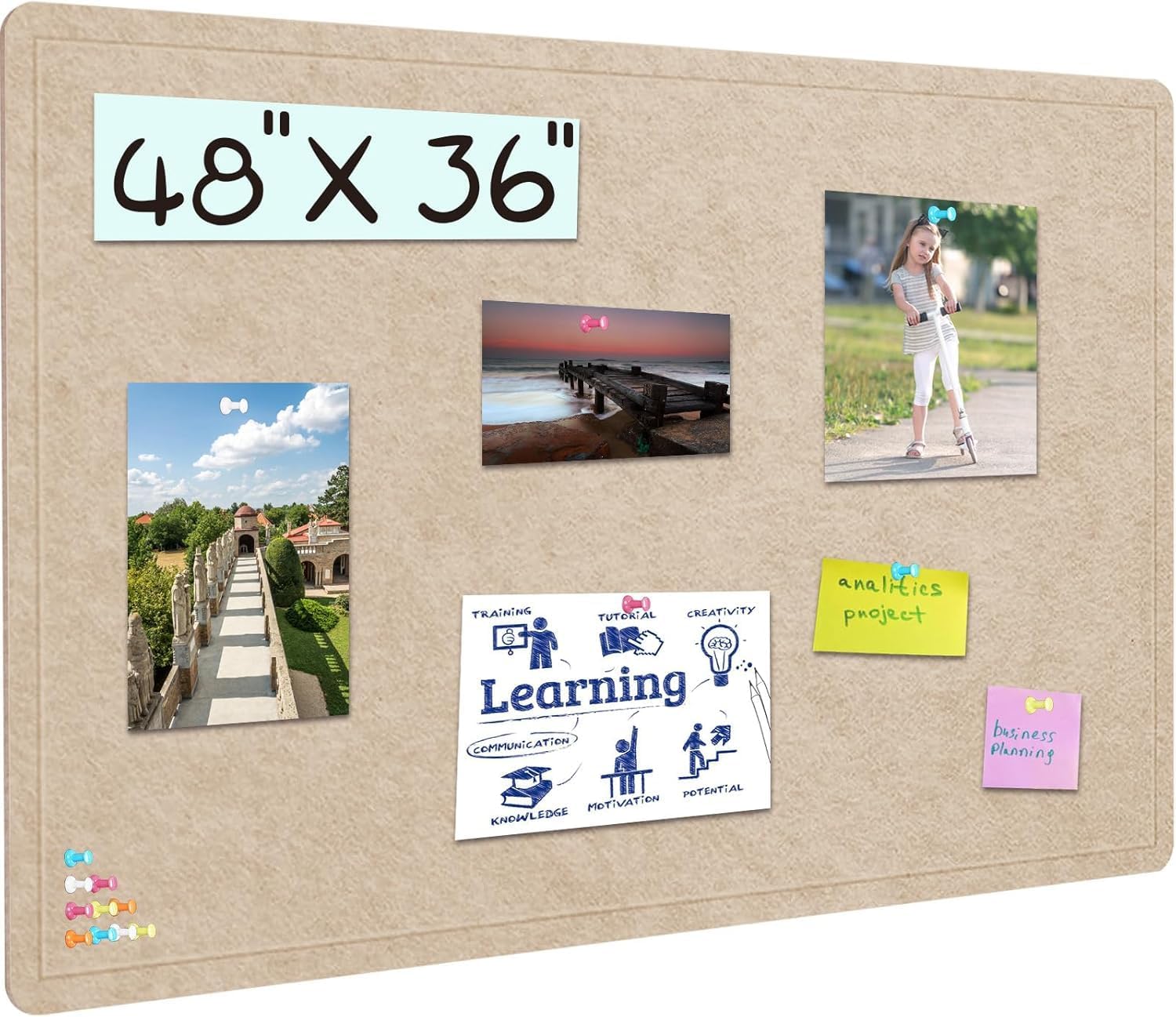 Large Bulletin Board, 48 X 36 inches Felt Board Notice Pin Board, 4' x 3'Cork Board Alternative for Wall, Self-Adhesive Vision Board Mood Board Foldable Photo Board with 30 Pushpin (Beige Brown)