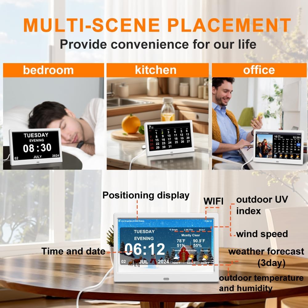 Digital Alarm Clock with Date and Time for Elderly Digital Calendar Clock Photo Frame- Auto Dimmable Display 15 Alarm Options (10 inch White)