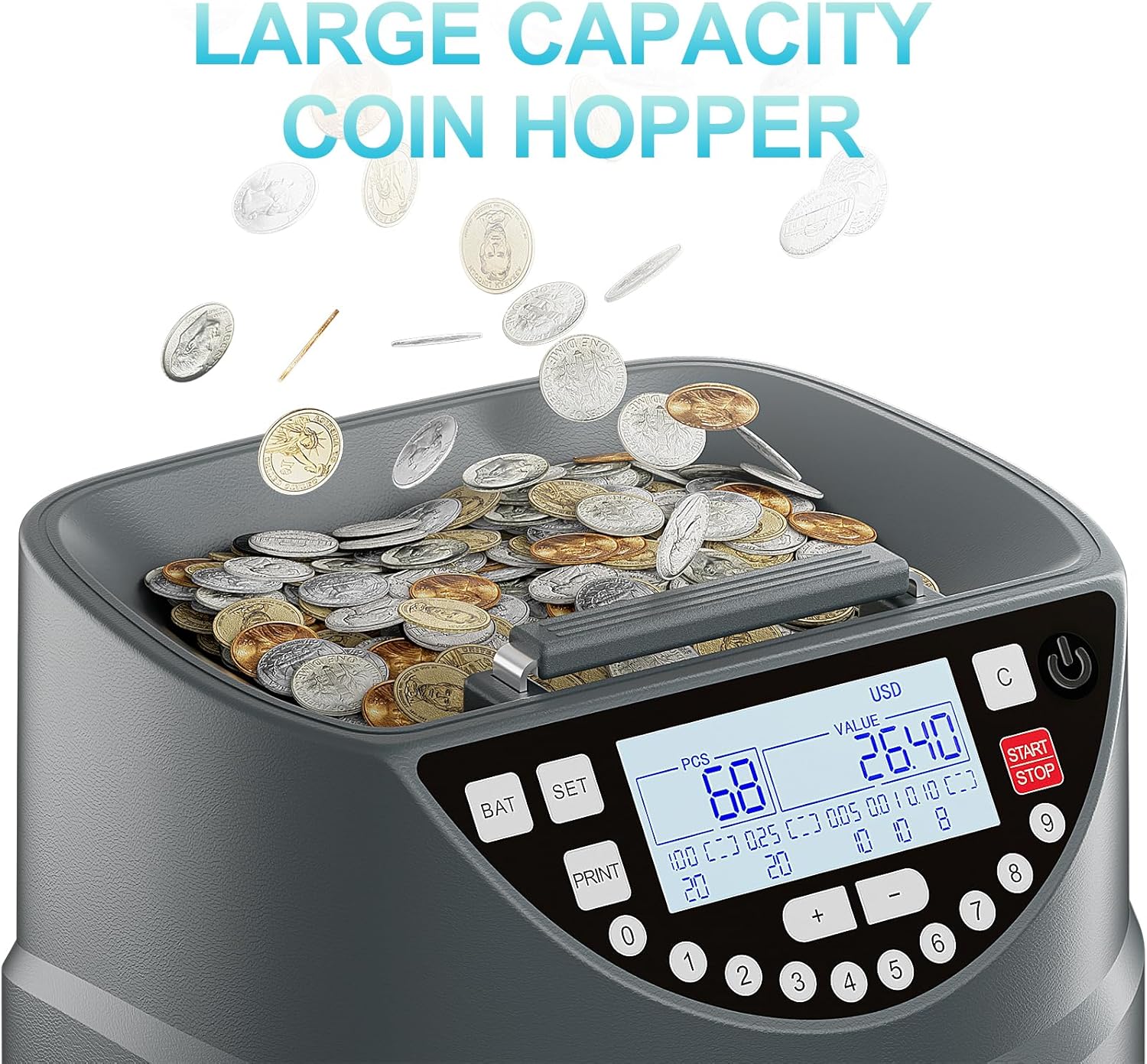 - 【High Capacity】: With a hopper that holds up to 1,500 coins, this sorter processes coins at 300 coins per minute, efficiently sorting five denominations simultaneously.