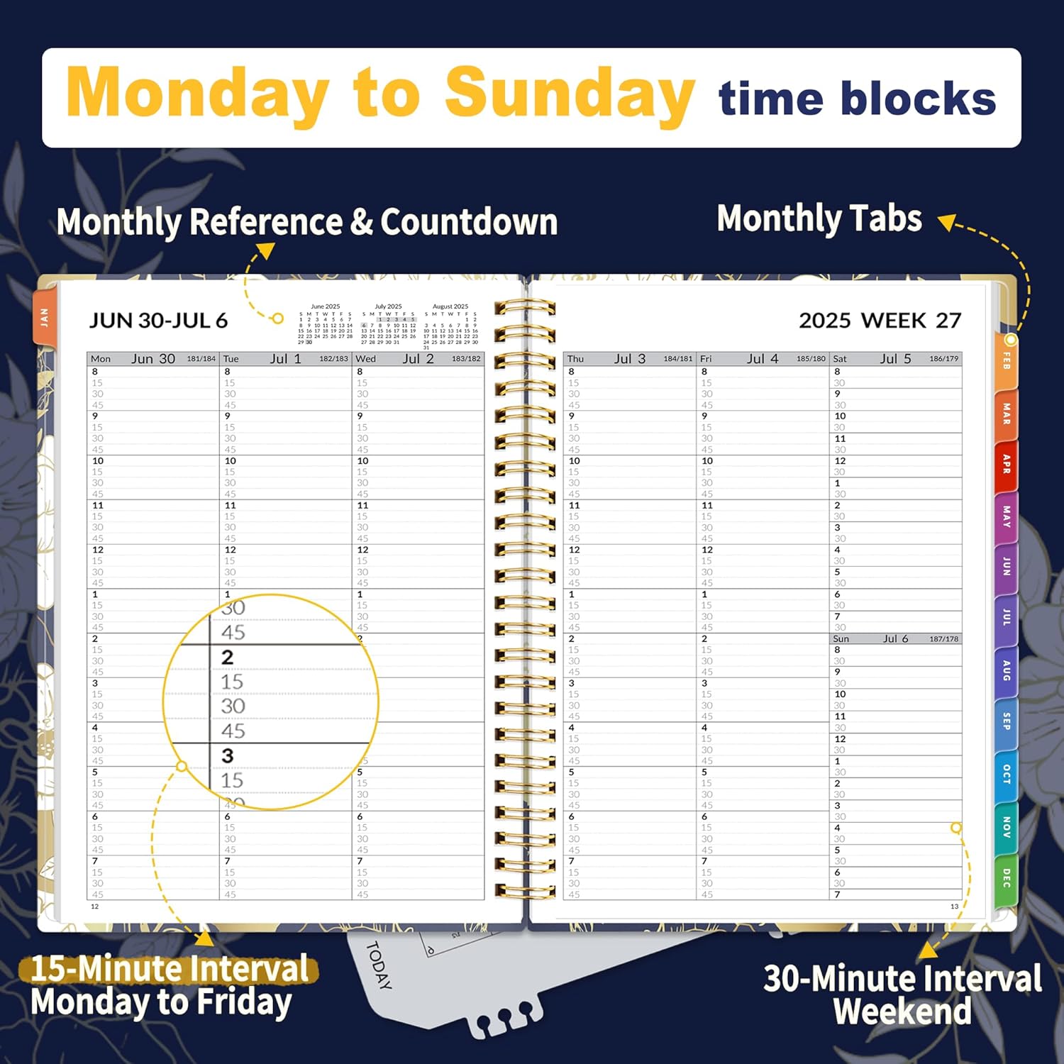 • Weekly View: 2-page weekly layout from Monday to Sunday, 15-minute time slots in increments from 8:00 a.m. to 7:45 p.m. on weekdays, and 8:00 a.m. to 7:30 p.m. on weekends, 3-month reference previews, allowing you to manage time and track appointments easily.