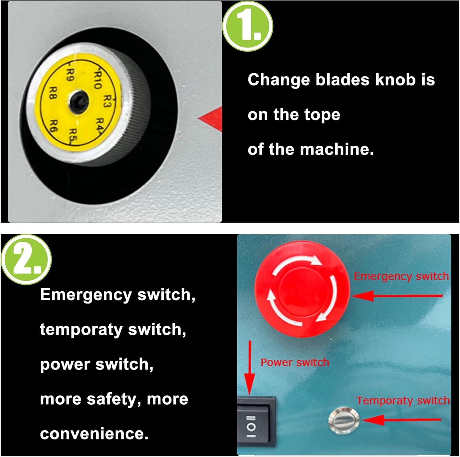 - Parameter- Max. Angle: R10; Min. Angle: R3; Max. Cutting Height: 2.75in(70mm); Working Frequency: 60 times/min; Power Supply: 110V/180W; Machine Net Weight: 83.6LB(38KG); Number of knives 7 (R3,R4,R5,R6,R8,R9,R10); Note: When the machine working, please keep hand away the paper press. Change blades knob is on the top of the machine