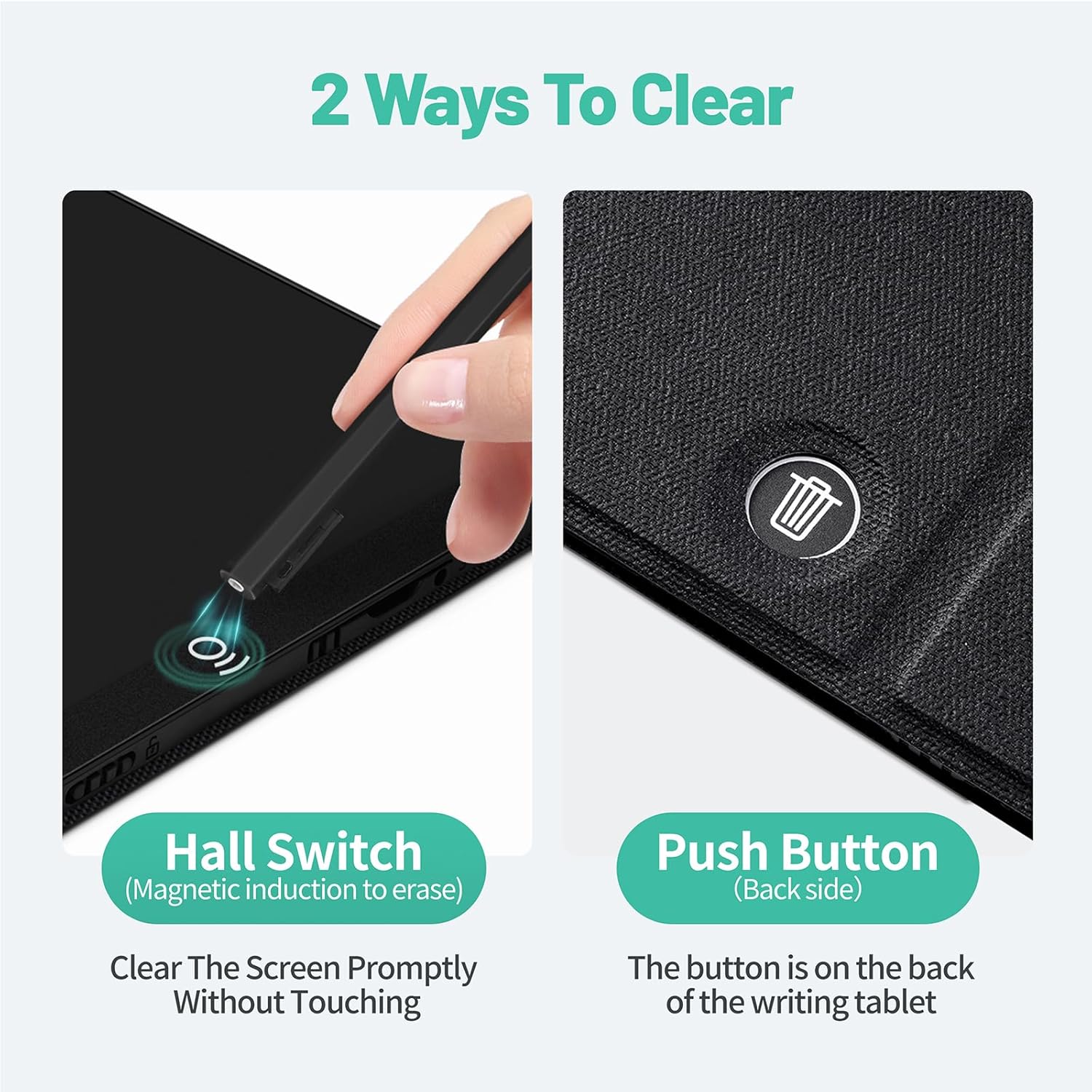 - 2 Ways Erase: In addition to the LCD writing board with push button to clear the screen, new non-touch screen clear mode; The non-touch erasing on the front of the writing tablet, while a push-erase button on the back; Hold one end of the magnetic stylus near the circle on the front of the tablet, and the content on the screen will be immediately cleared, when you need to open the lock screen button