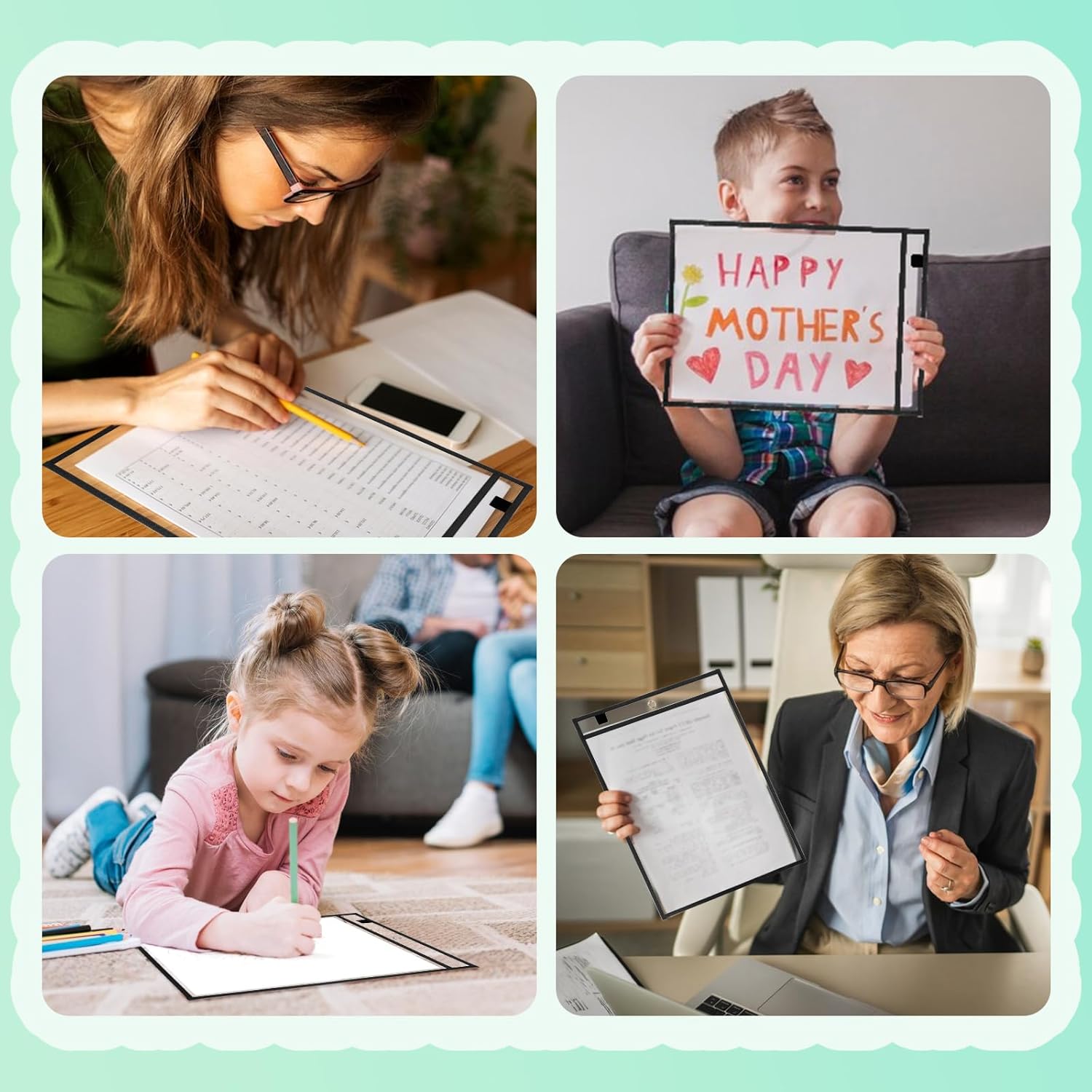 • Reusable oversized dry erase pockets can easliy be cleaned with a tissue or cloth without leaving traces, to reduce the amount of paper being used.