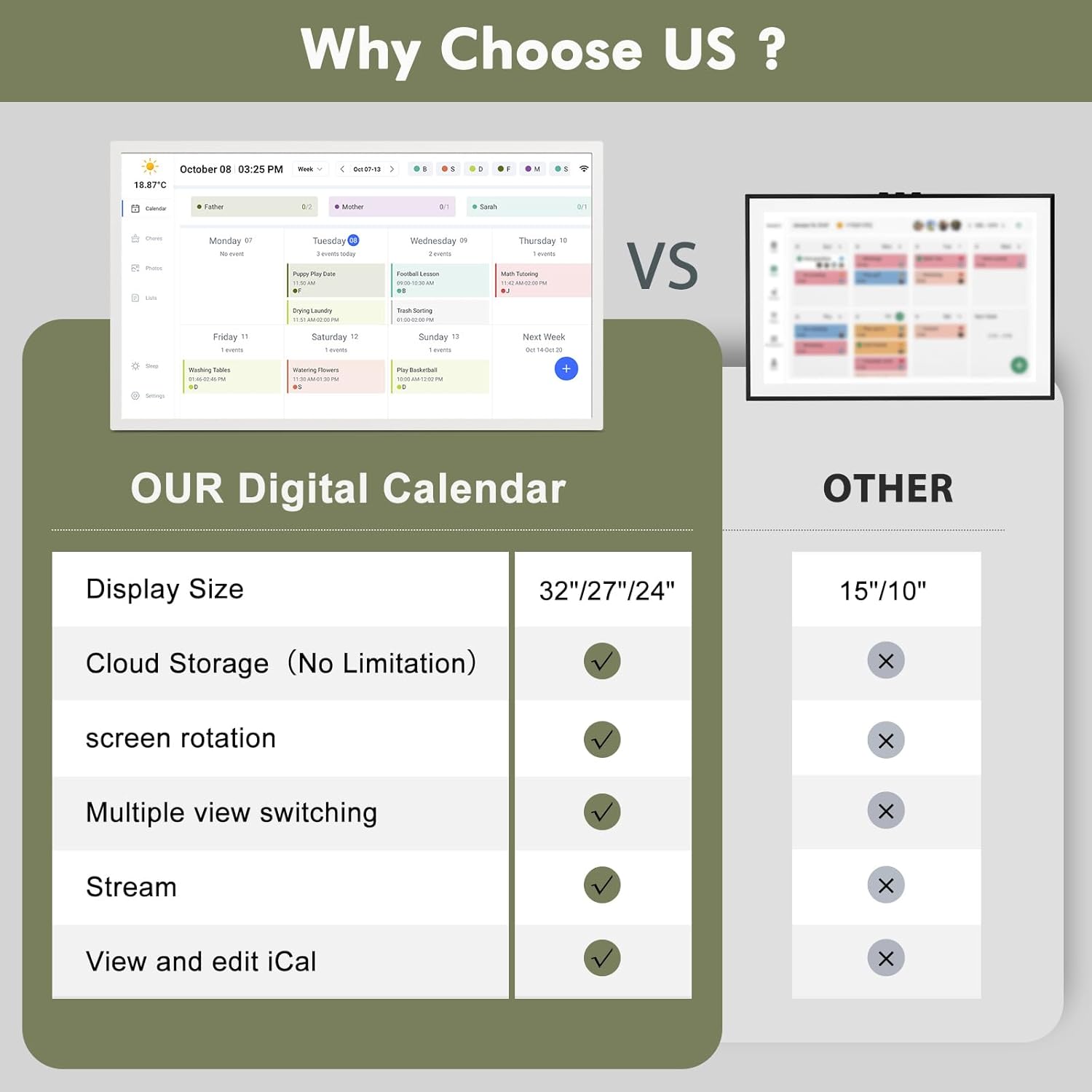• ☪Also a Digital Frame with Unlimited Cloud Storage: This multi-functional electronic calendar does more than organize your schedule—it also serves as a 32GB digital photo frame to display your favorite memories. With unlimited cloud storage, you can upload endless photos without worrying about space. An energy-saving sleep mode adds eco-friendly convenience. Ideal for home or office, it blends organization with meaningful décor.