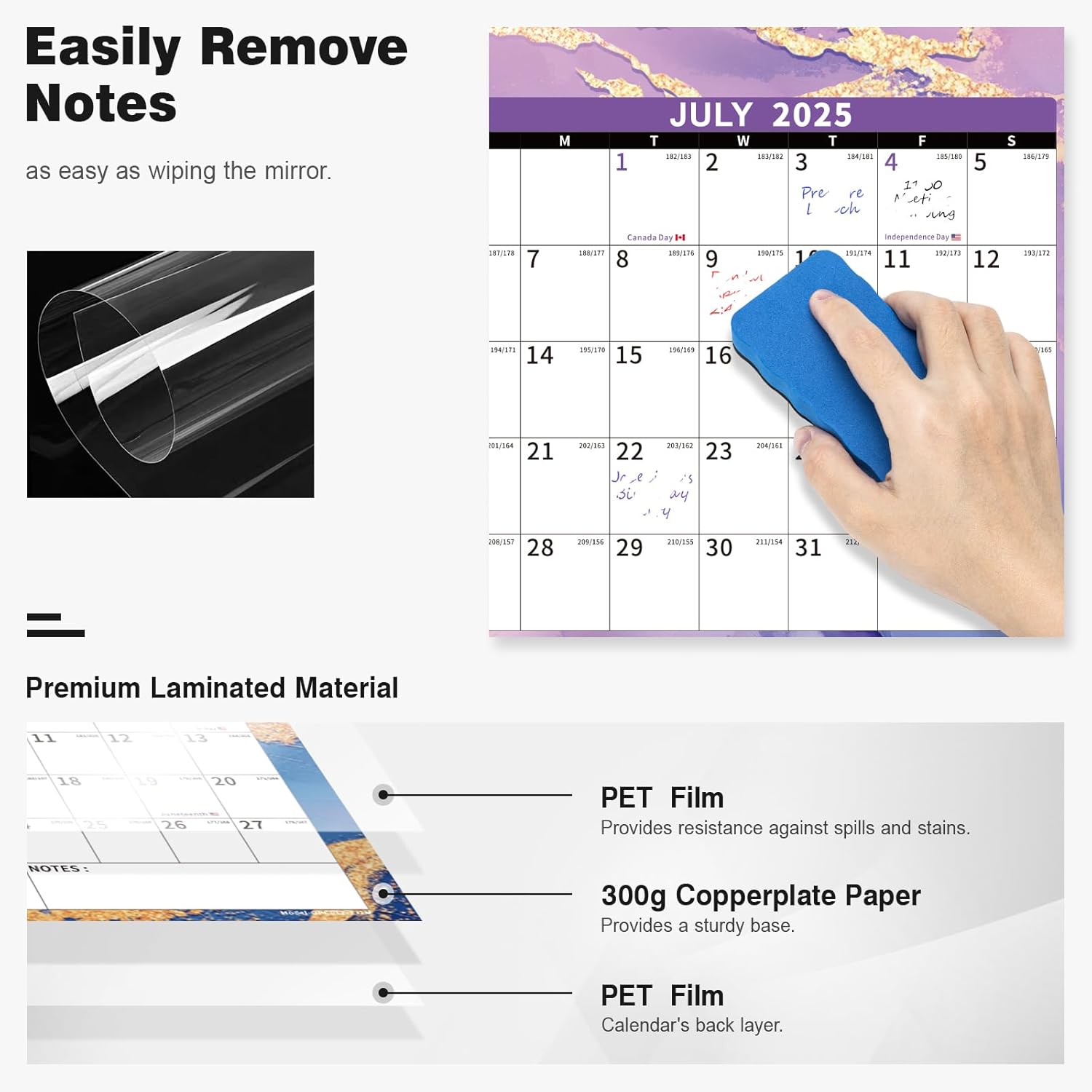 - ⨠Laminated Calendar with Dates: Waterproof wall calendar comes with a mini eraser, four dry-erase markers, 12 push pins, and 10 transparent round stickers. 12 months calendar covers the time range from July 2025 to June 2027, making it perfect for long-term use.