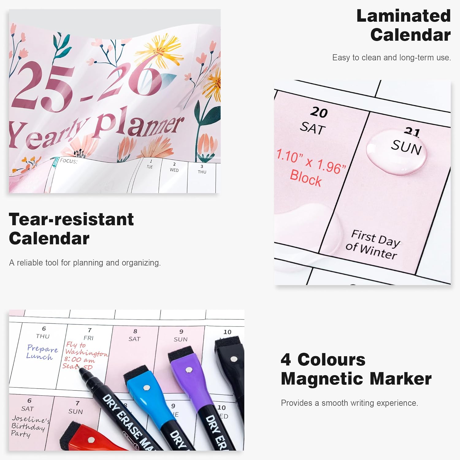 - ⨠Laminated Calendar with Dates: Waterproof wall calendar comes with a mini eraser, four dry-erase markers, 12 push pins, and 10 transparent round stickers. 12 months calendar covers the time range from July 2025 to June 2026, making it perfect for long-term use.