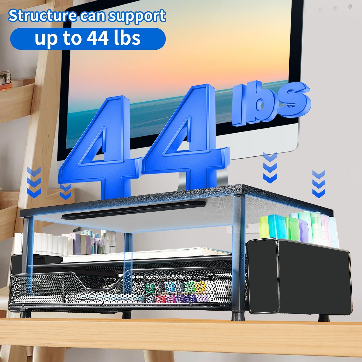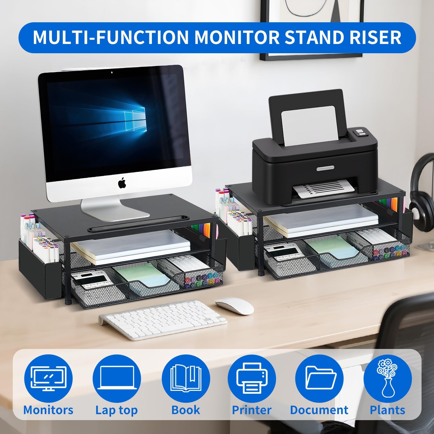 - Space-saving Solution: This dual-tier desk shelf computer stand with a drawer and 2 pen holders provides ample storage for your office supplies and office desk accessories. Enjoy a tidy workspace that enhances your daily mood