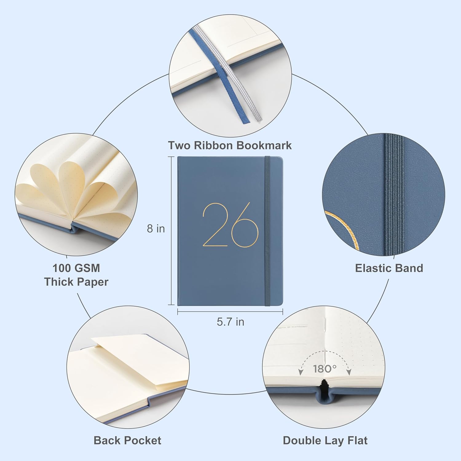 And Per Se 2026 Planner-Daily, Weekly & 15-Monthly Leather Hardcover Planner, 5.7" x 8", Daily Schedule, Monthly Tabs, 100 GSM Thick Paper, Back Pocket(Dark Blue)