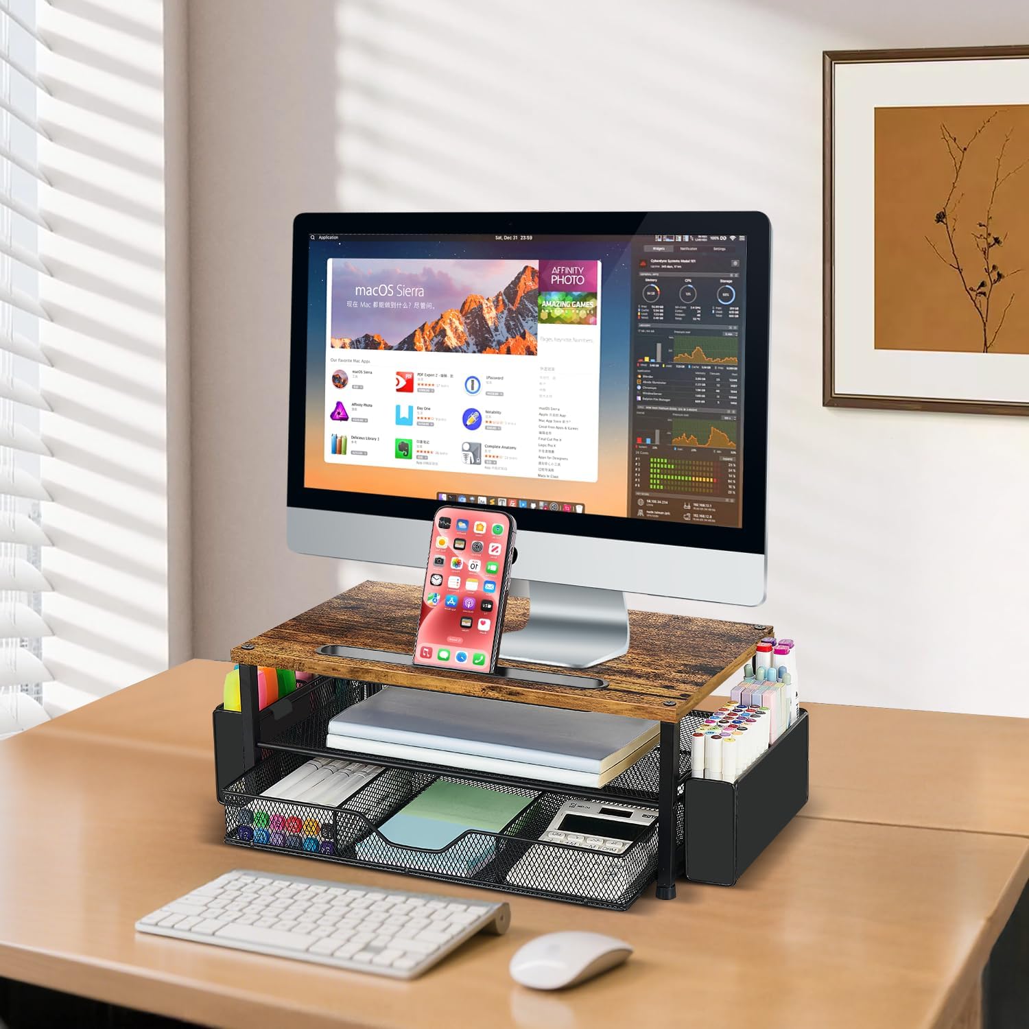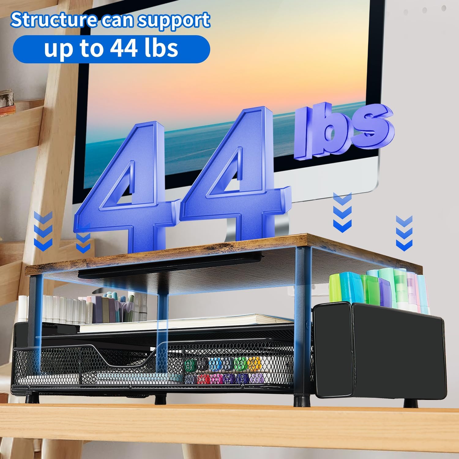- Space-saving Solution: This dual-tier desk shelf computer stand with a drawer and 2 pen holders provides ample storage for your office supplies and office desk accessories. Enjoy a tidy workspace that enhances your daily mood