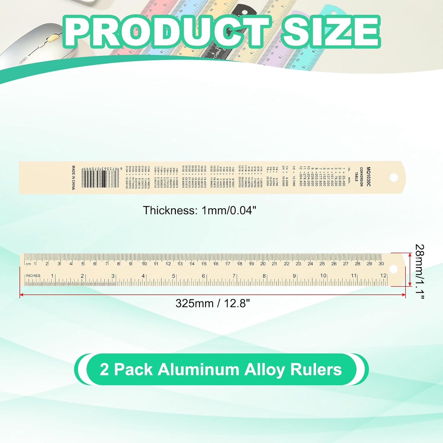 - Specification: Color: Yellow; Material: Aluminum Alloy; Mileage: 30cm/12"; Total Length: 325mm / 12.8 inch; Width*Thickness: 28 x 1mm / 1.1 x 0.04 inch; Packing List: 2 Pack x Aluminum Alloy Rulers