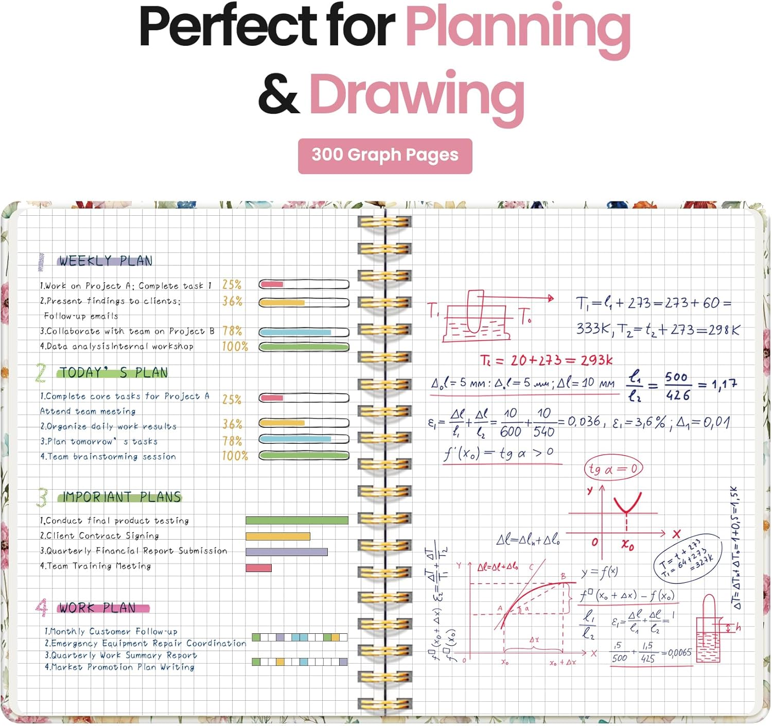Spiral Graph Paper Notebook Journal for Work, 300 Pages, Thick B5 (7.1"x10") Grid Journals for Women & Writing, Hardcover Notebook for Note Taking, Perfect for Work School Note Taking Business, Floral