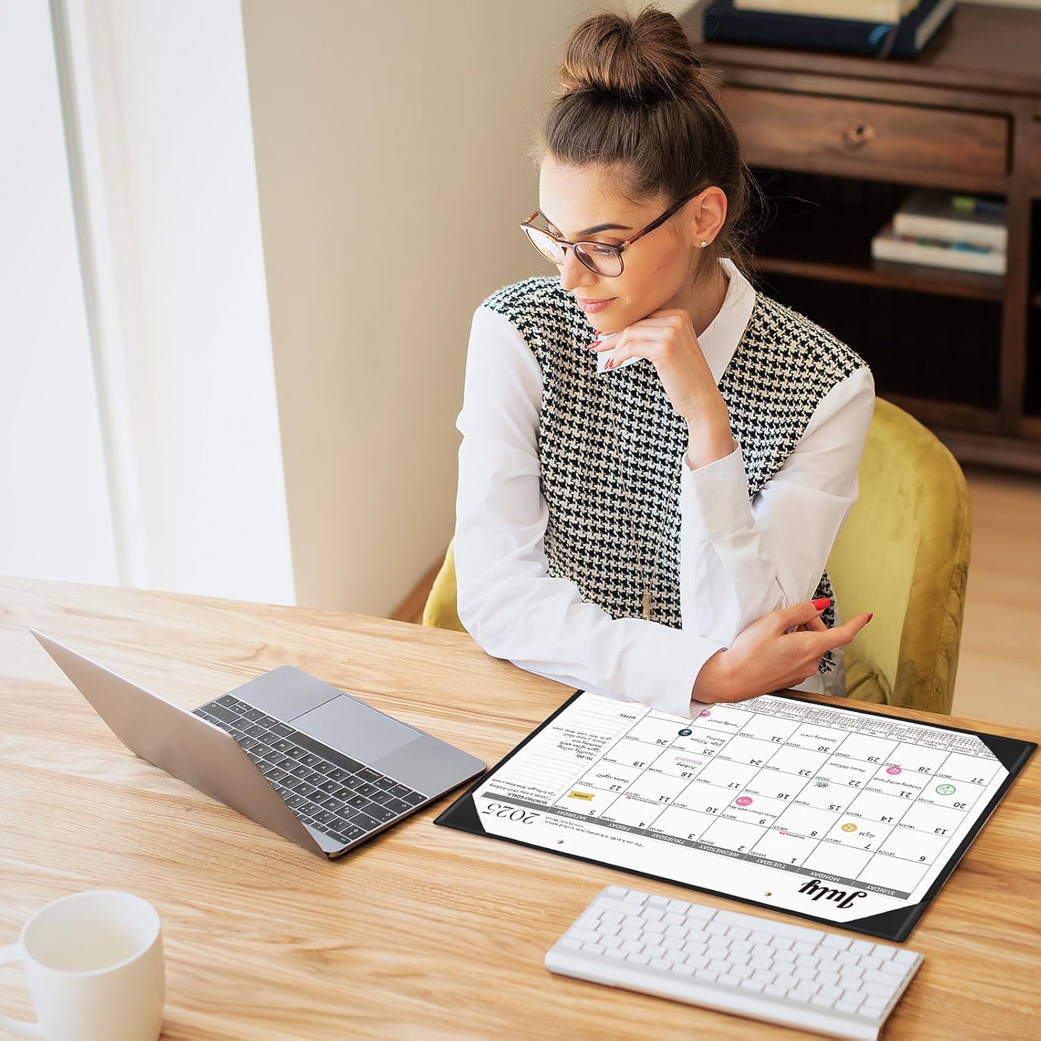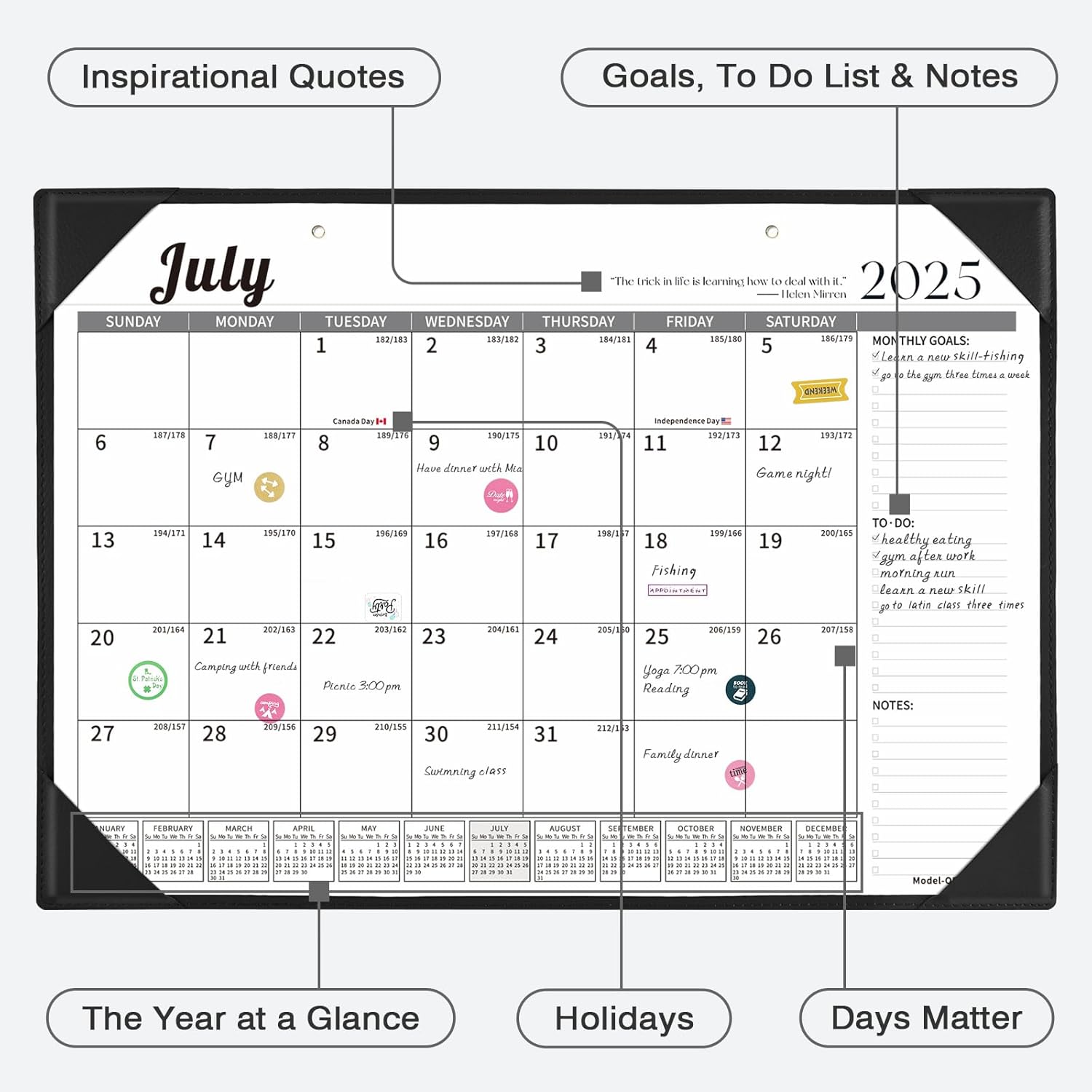 - Monthly Desk Calendar with Stickers: One month per page layout help you organize your monthly plans and goals. The calendar set includes planning stickers. A variety of planning stickers can also add some interest to the calendar.