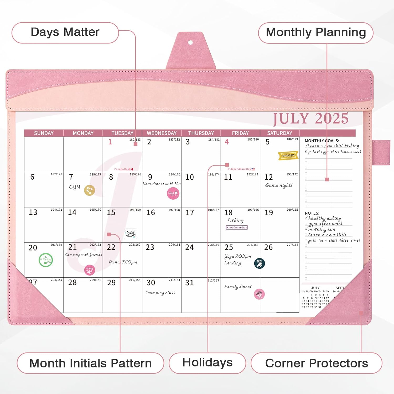 Ospelelf Leather Desk Calendar 2025-2026 Large 12"x17" Monthly Planner Pad with Protective Cover 18 Months July 2025 to Dec 2026 Pink