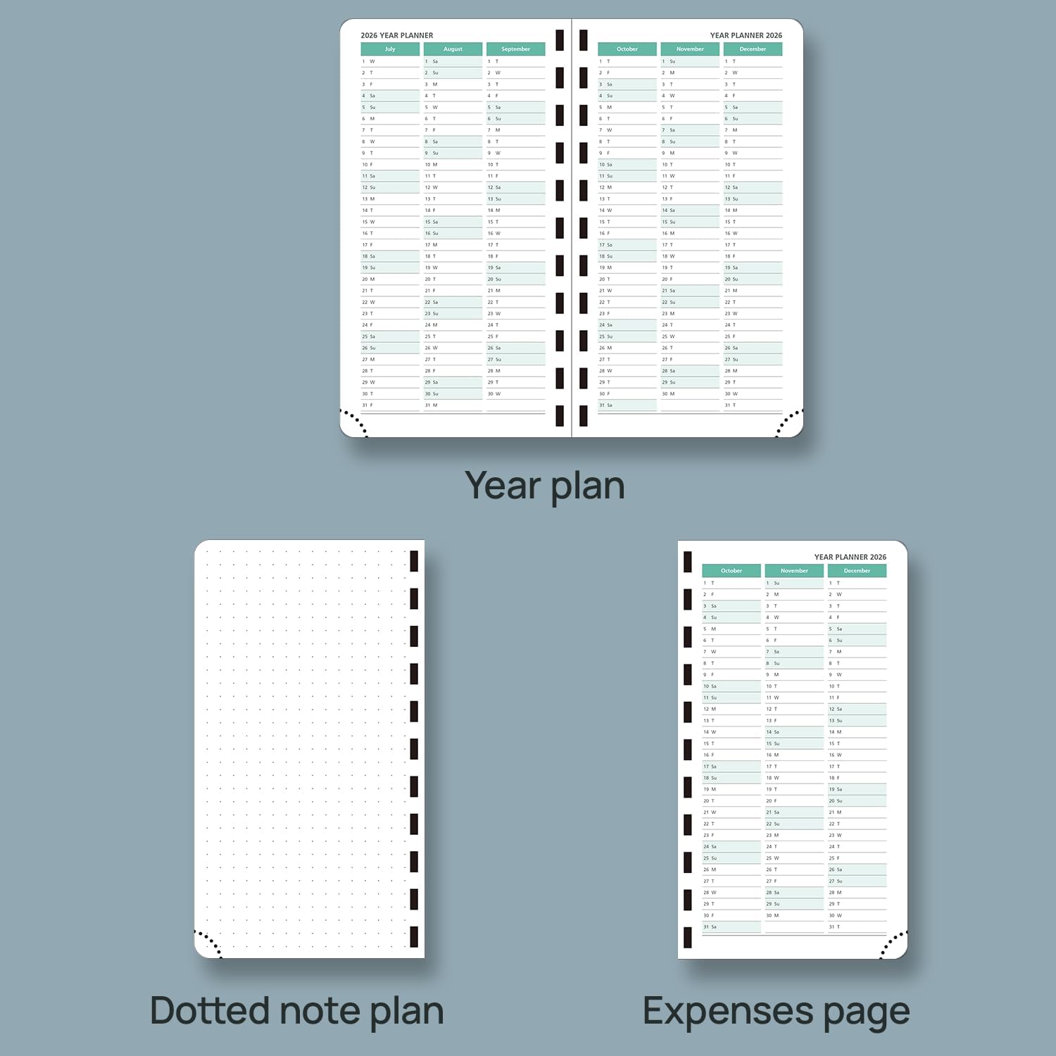 - EXTRA FUNCTION PAGES - The Planner Includes 2026-2027 Calendar, 2026 Holiday Reference, Year Planner, Monthly Expenses, Birthday & Important Date, and 6 dotted notes pages for detailed jotting for jotting down your ideas, thoughts or any other happy things in detail.