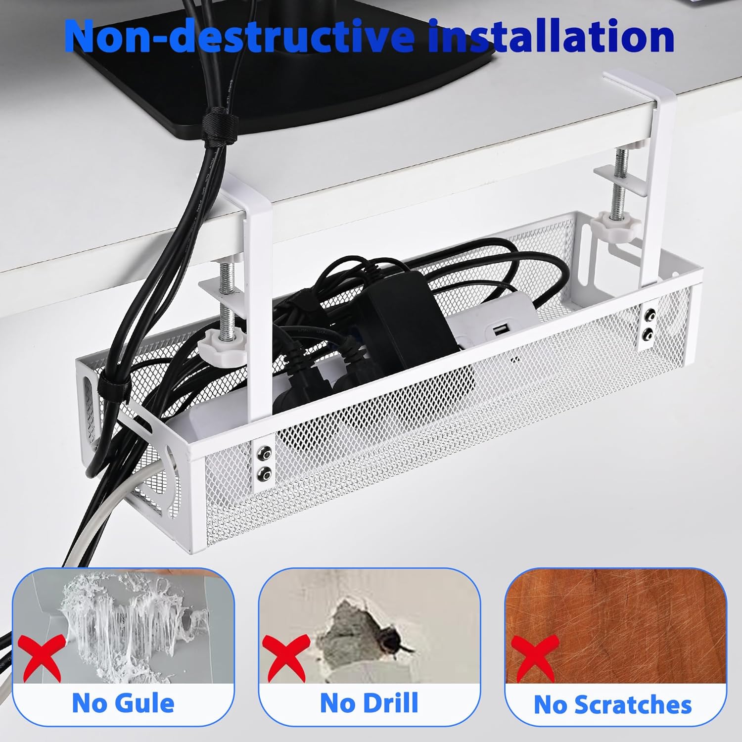 - No Drilling Required – Easy and Damage-Free Installation - The cable management tray features an innovative no-drill design with sturdy clamps, allowing for effortless attachment under your desk. It fits desks within 0.4" to 2.2" thick, so you can securely install it without the need for tools or causing any damage to your desk surface. It’s the perfect under-desk cable management solution for anyone looking to organize their workspace quickly and efficiently.
