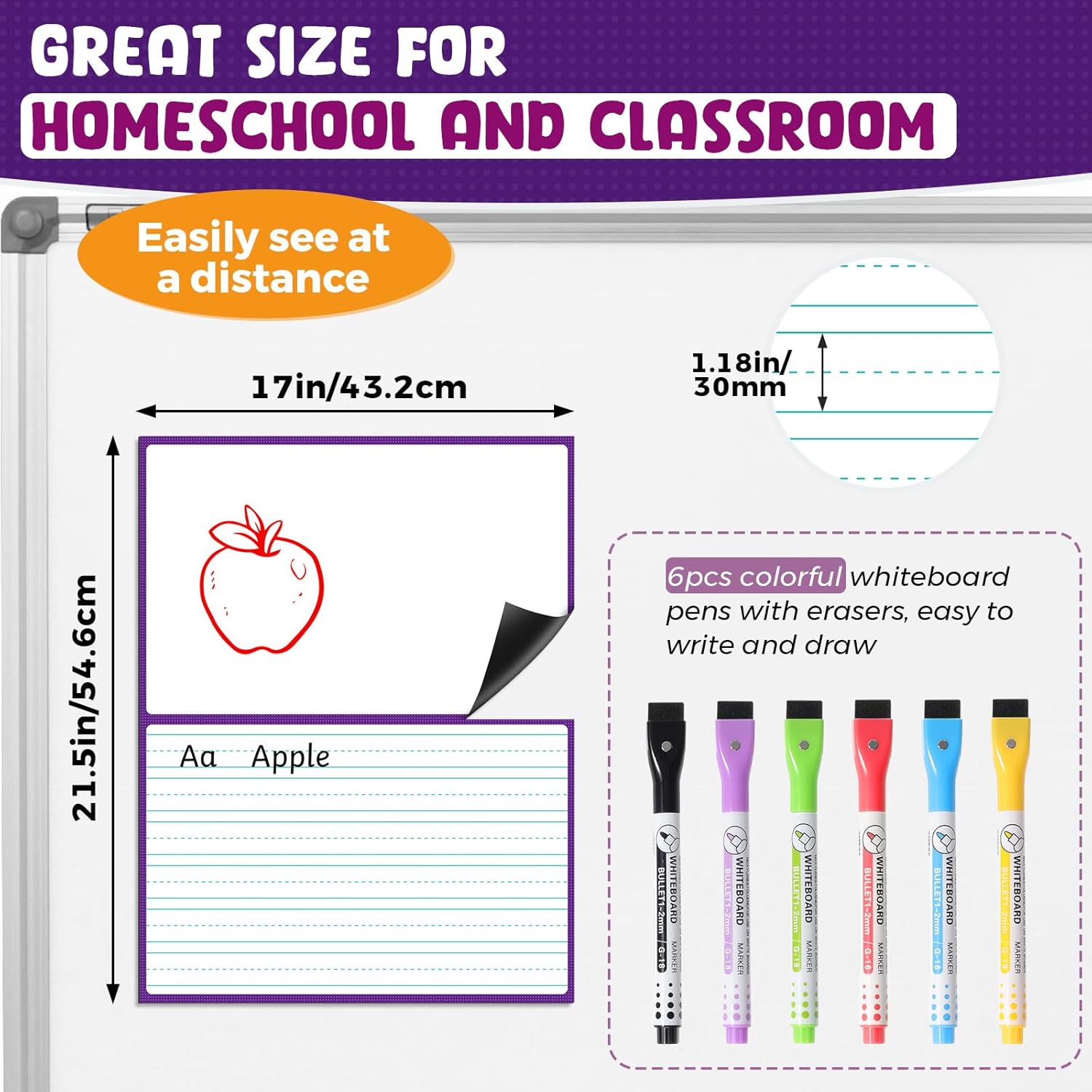 - Large Size Magnetic Dry Erase Whiteboard Sheet: Dry erase paper measures 17"x22" and 1.3"(32.8mm) spacing between the horizontal lines and offers plenty of space for handwriting or graphing to easily see at a distance. The Dry erase magnets set is great for teachers to making classroom demonstrations