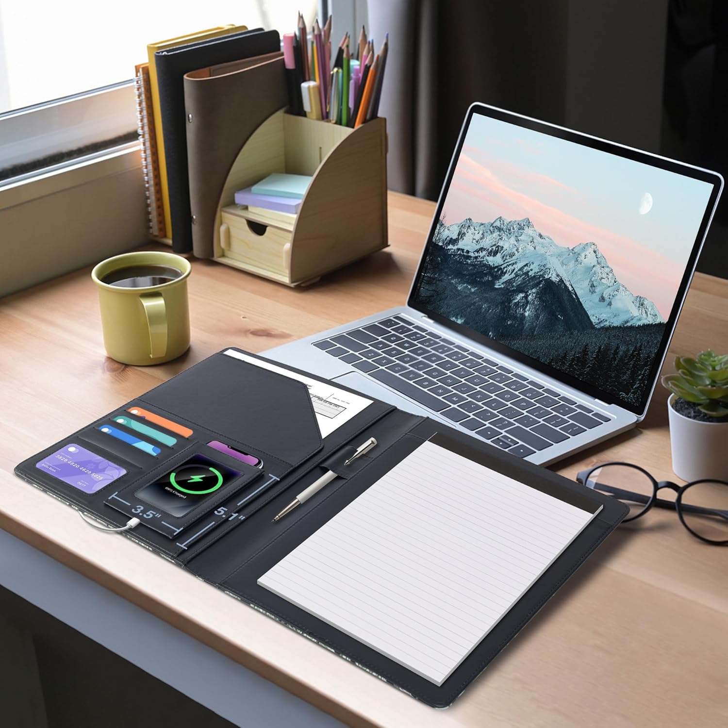 - 【Organized Storage】 This 360° foldable portfolio features a retractable transparent phone pocket (with a charging port) that accommodates phones up to 6.7 inches, plus 4 card slots adjacent to it. The right side includes a large pocket and holds the included notepad.