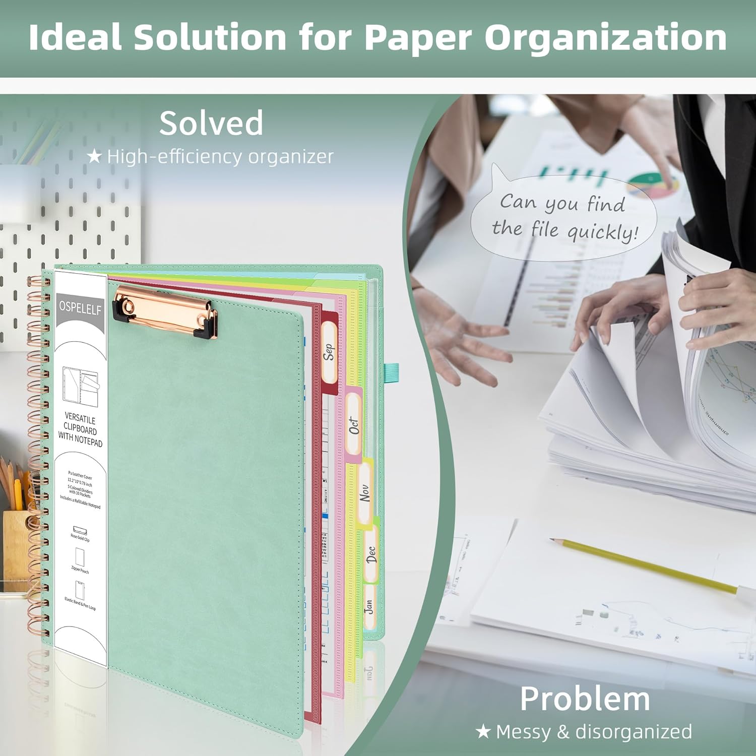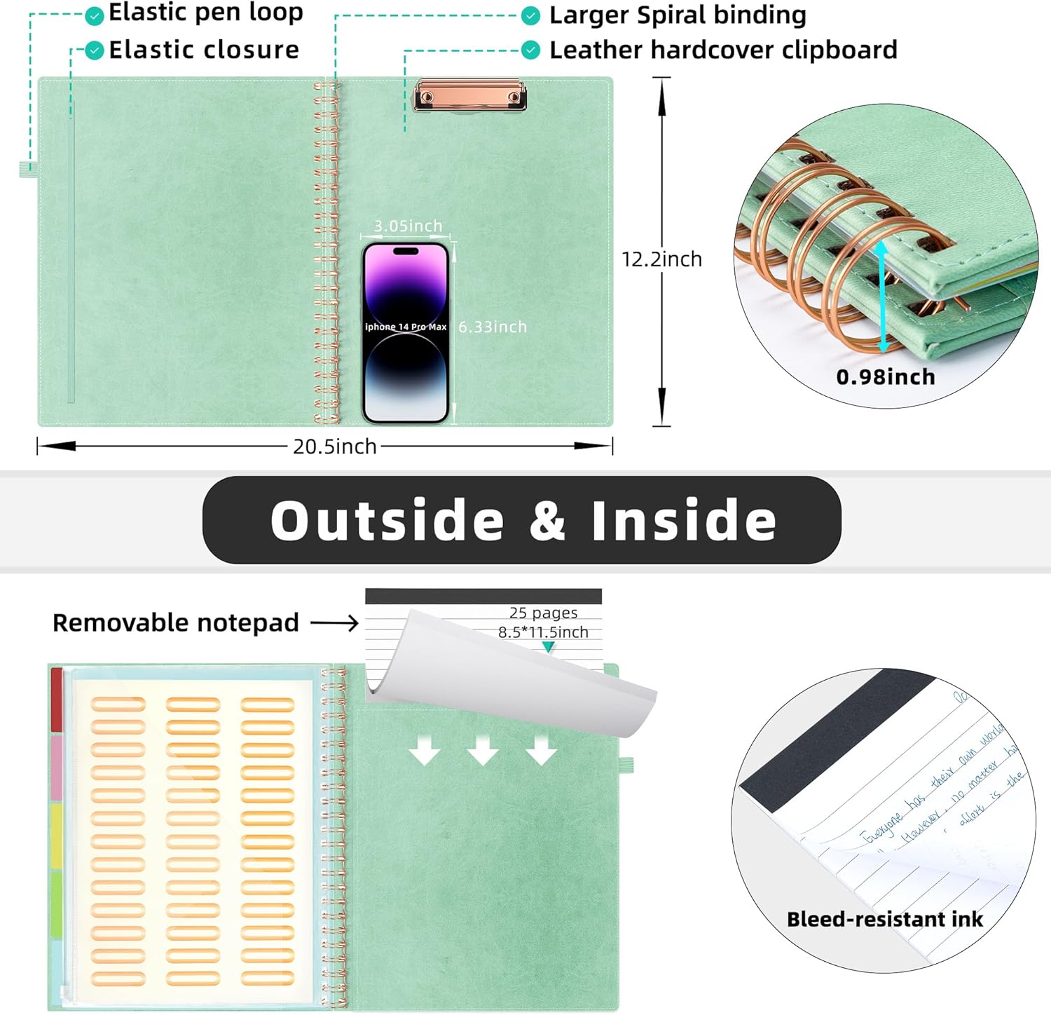 Ospelelf Leather Clipboard Folders with with Storage Zipper Pouch, Spiral Clipboard Folio with Notepad for Letter Size, 5 Folders with 10 Pockets, 39 Divider Label Stickers (Light Green)