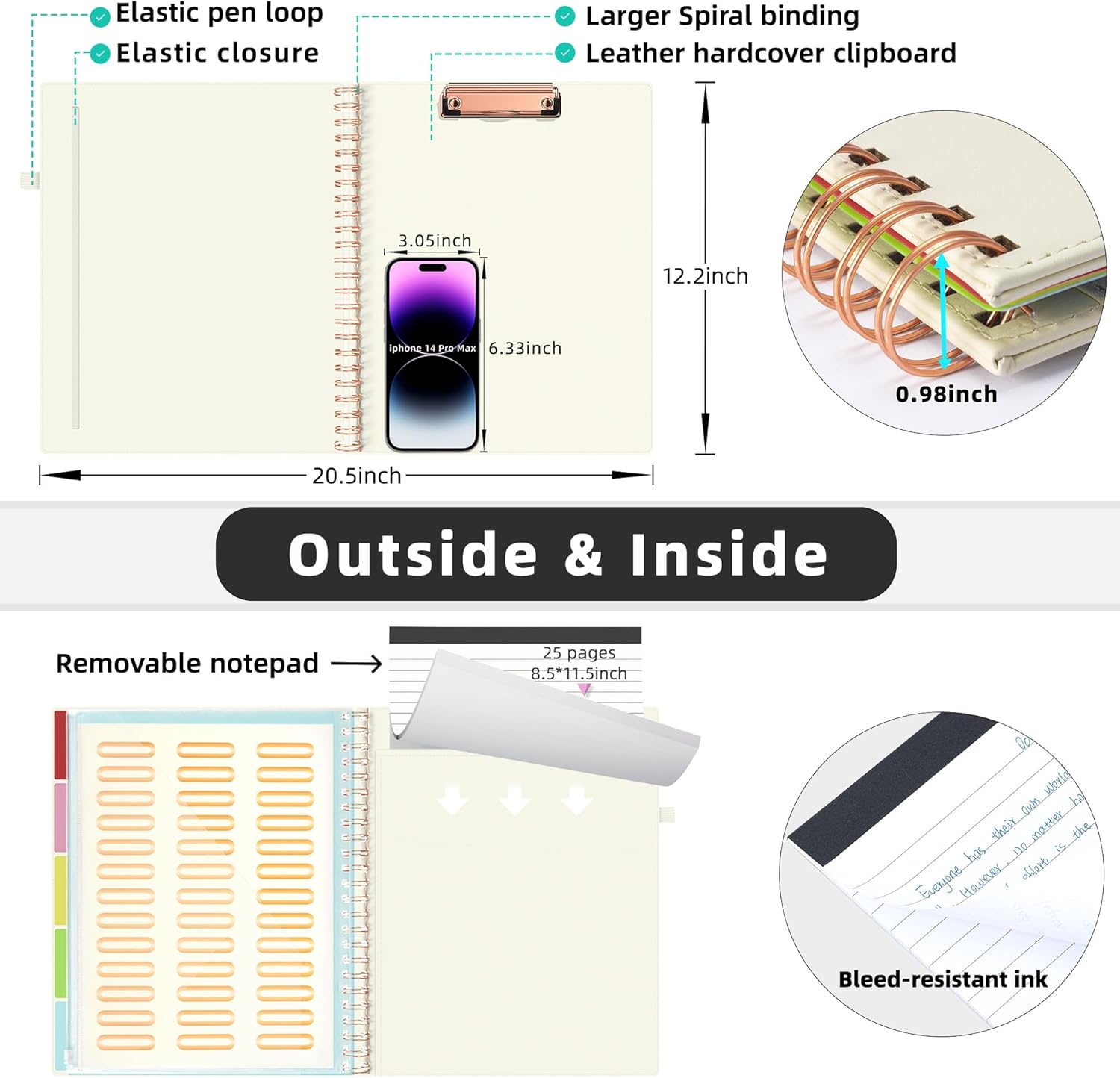 - 【powerful functions】Low-profile clip arc design make it easy gripping and extraction paper, holds up to 80-100 sheets paper. Clip board has a Hidden retractable hanging hole on the top, Easy to hang. Pen Loop for quick, easy storage. Double-loop Metal Spiral have the ability to flip the cover to the backside and use it like a clipboard, no creases and cracks to offer durability. Elastic closure, The elastic band keeps the portfolio closed and prevents contents from getting damaged.