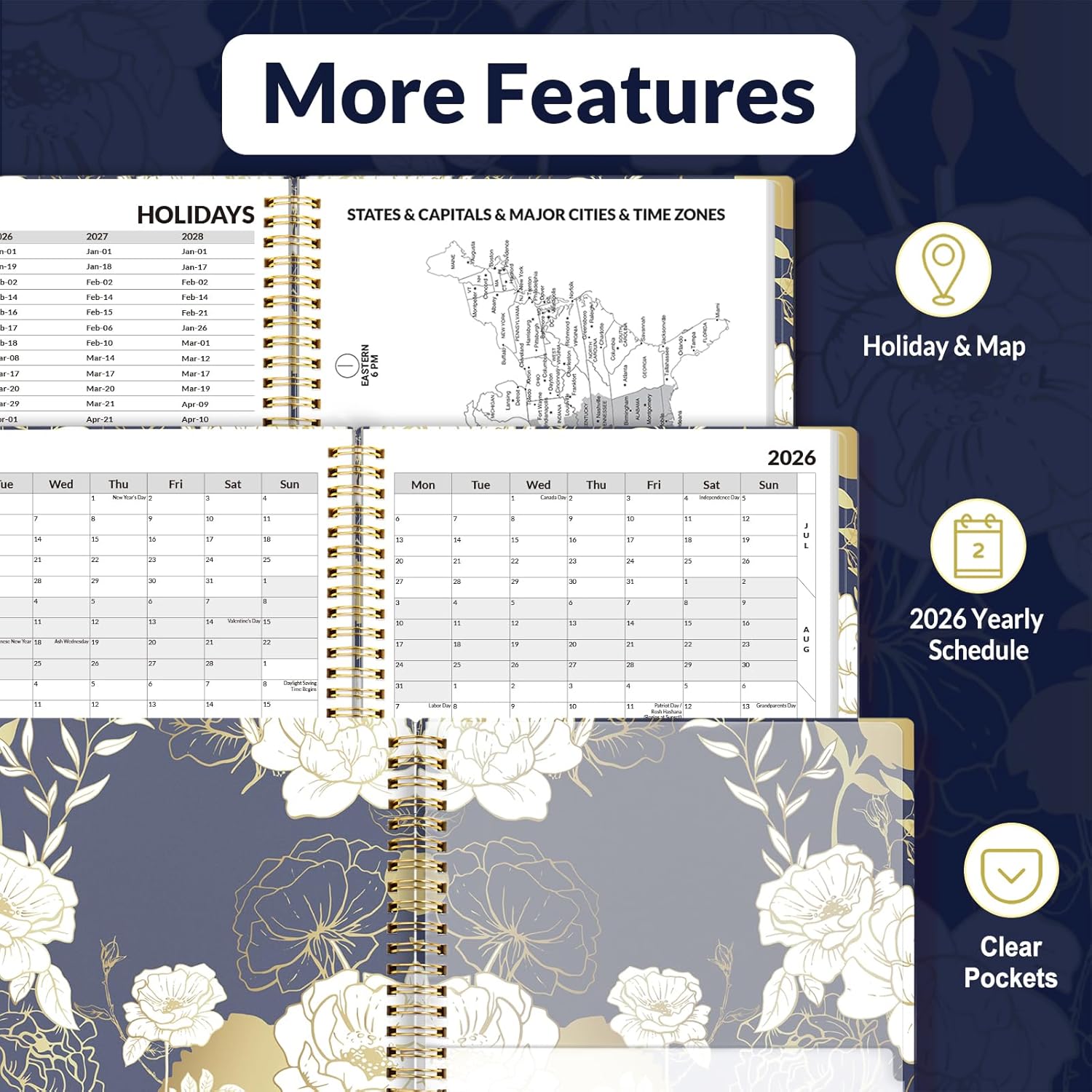 • Additional Features - The weekly planner includes 2026-2028 calendars, year schedule for full year 2026, holiday lists, contact pages, notes pages, important dates, and US time zone map. Rainbow monthly tabs simplify navigation and add a stylish, playful element to the planner's aesthetic.