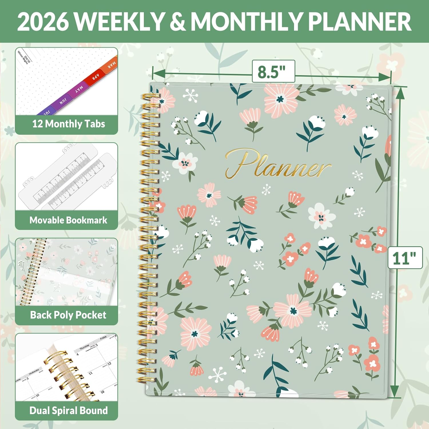 SUNEE 2026 Weekly and Monthly Planner - from January 2026 - December 2026, 8.5"x11" Daily Agenda Planner with Monthly Tab, Flexible Cover, Note Pages, Pockets, Bookmark, Green Wildflowers
