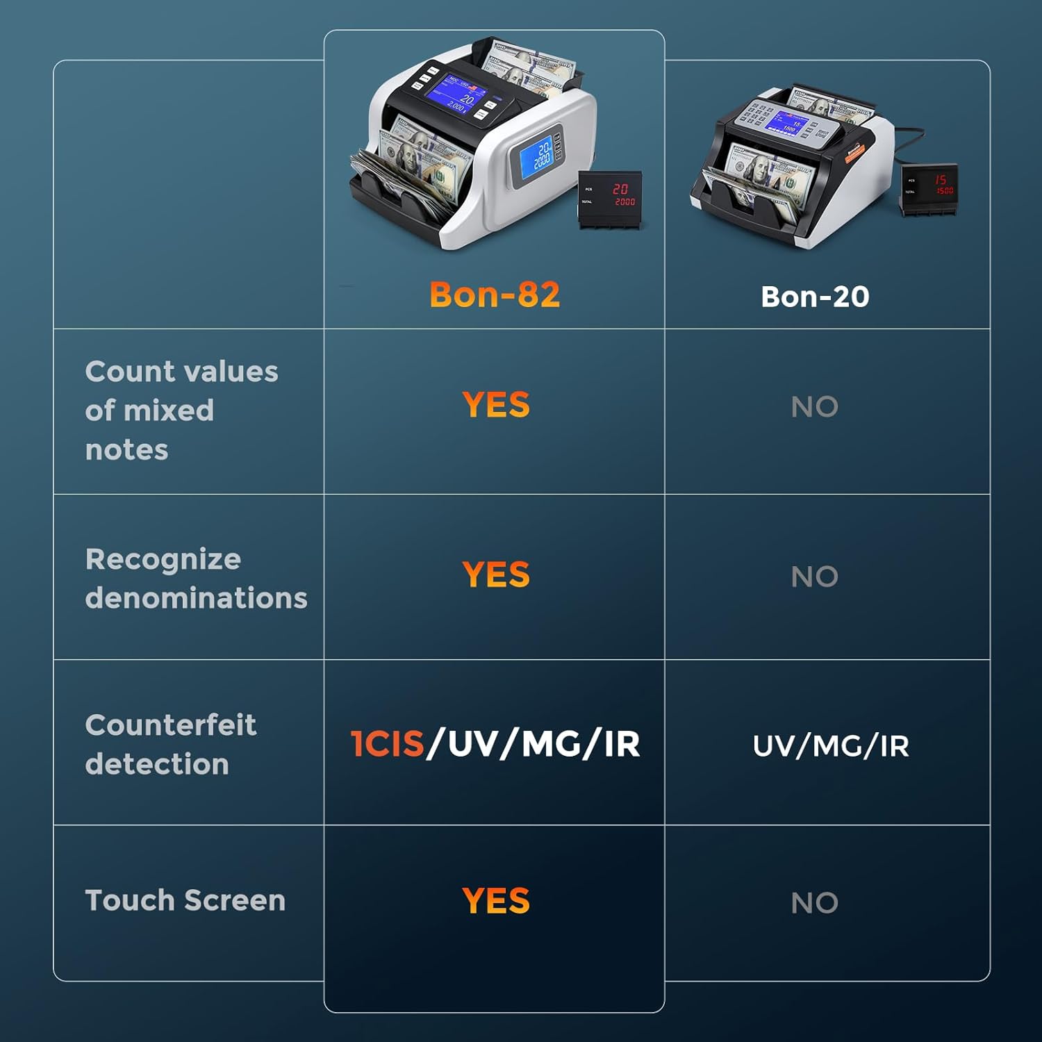 - Detect Counterfeit with 1CIS - Money counting machine can verify banknote authenticity and detect counterfeit with UV, MG,IR, 1CIS detecting technology, which can ensure secure and efficient currency handling.
