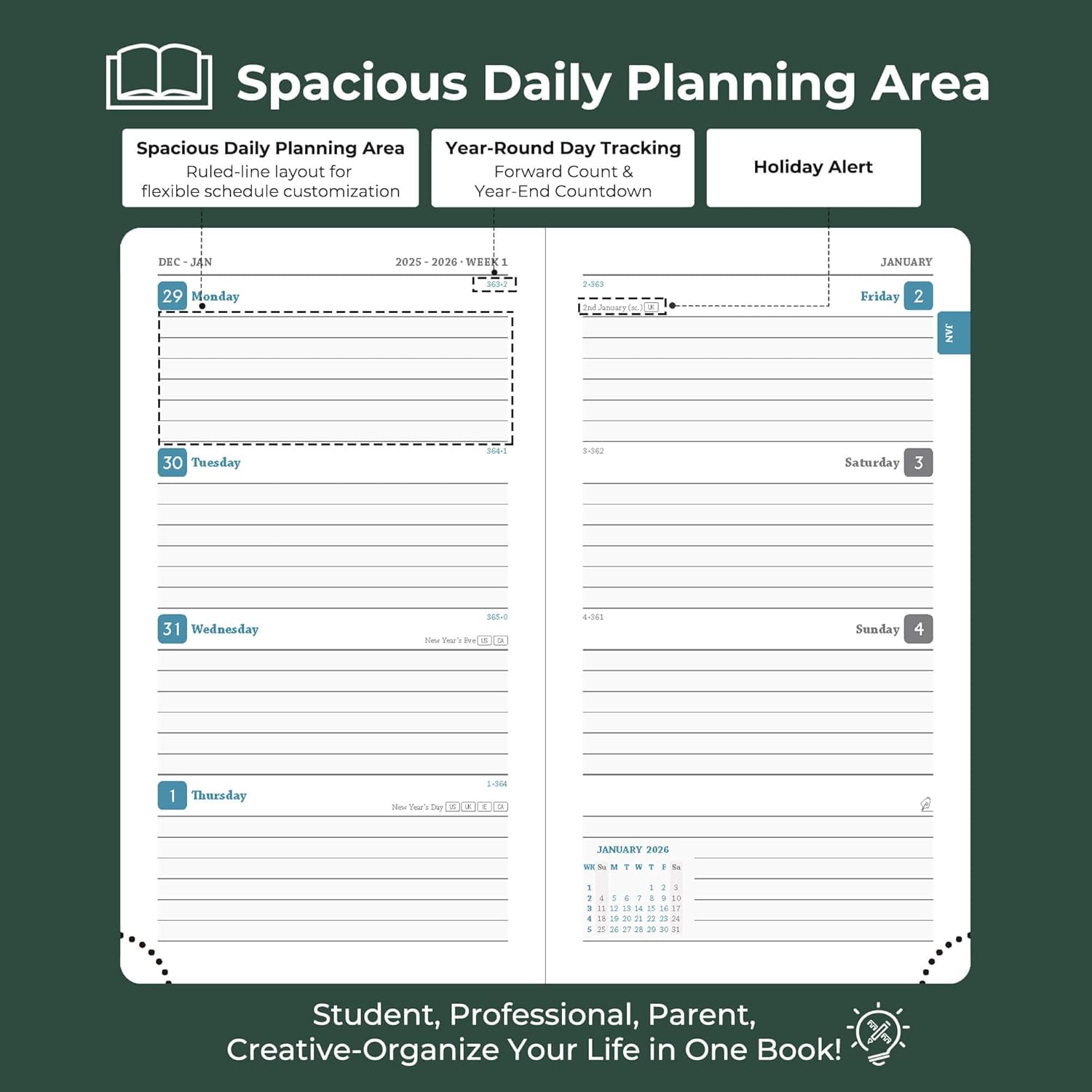 - Professional Grade Material for Your Daily Planner: Crafted with FSC 100GSM thick paper, this 2026 planner ensures good writing with markers while gentle on your eyes through its ivory white pages. The leather soft cover and lay flat binding make it a calendar planner companion for busy professionals, students, and families