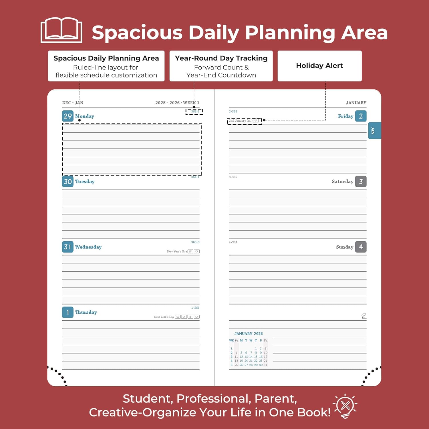 • Professional Grade Material for Your Daily Planner: Crafted with FSC 100GSM thick paper, this 2026 planner ensures good writing with markers while gentle on your eyes through its ivory white pages. The leather soft cover and lay flat binding make it a calendar planner companion for busy professionals, students, and families